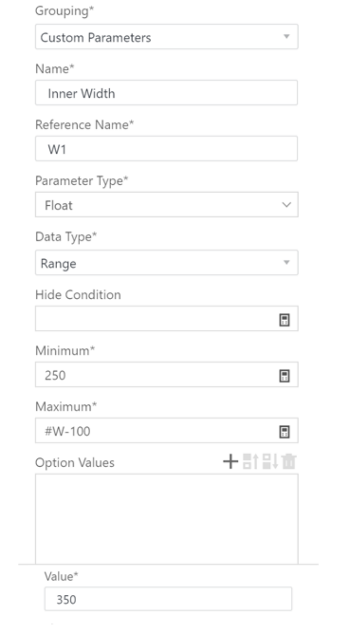 2.4. Add an advanced parameter named "Inner Width" with reference name W1. Value type is set to a range (e.g., range, minimum value 250, maximum value: #W-100, current value 350). Click on Create.