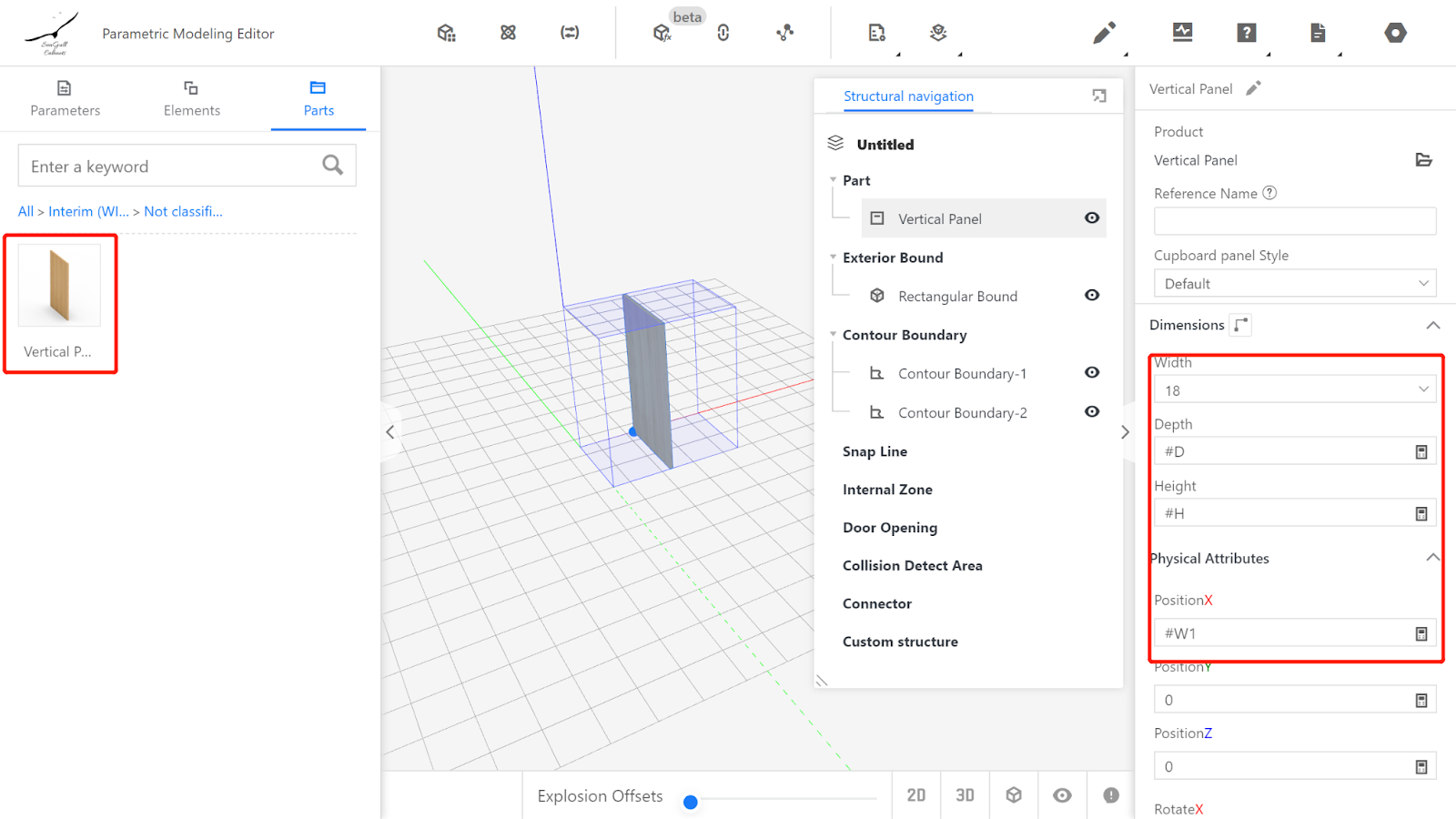 3.1. Insert the previously created vertical arc panel from the component library as the middle vertical panel. Set the dimensions and physical properties for the vertical panel: