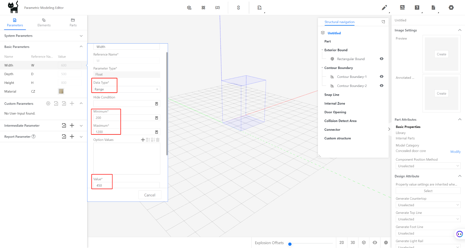 Width (W) - Represents the X-directional size of the door core model, usually defined as a range (e.g., range from 200 to 1200, current value is 450).