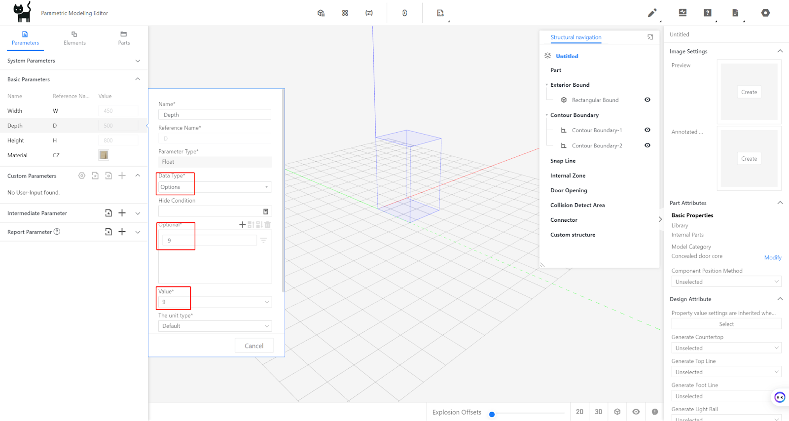 Depth (D) - Represents the Y-directional size of the door core model, i.e., the thickness of the core, with a single or multiple selectable value types (e.g., selectable options: 9, current value is 9).