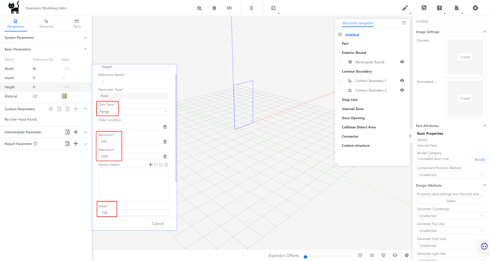 Height (H) - Represents the Z-directional size of the door core model, usually defined as a range (e.g., range from 200 to 2400, current value is 700).