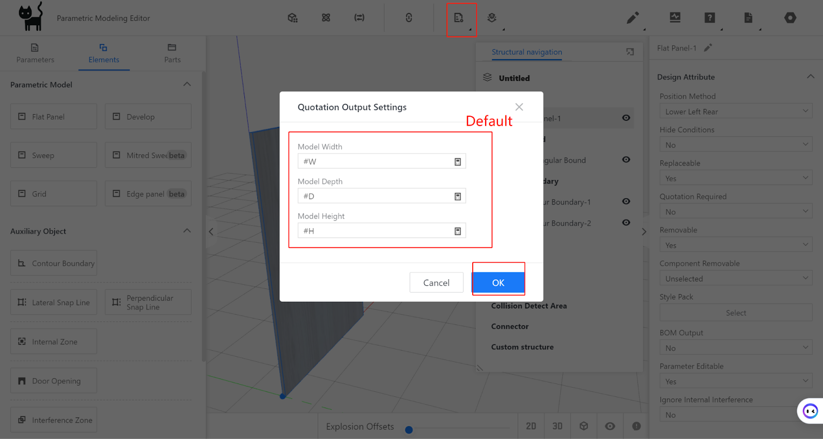 Default quotation output: Model Width - #W, Model Depth - #D, Model Height - #H;
