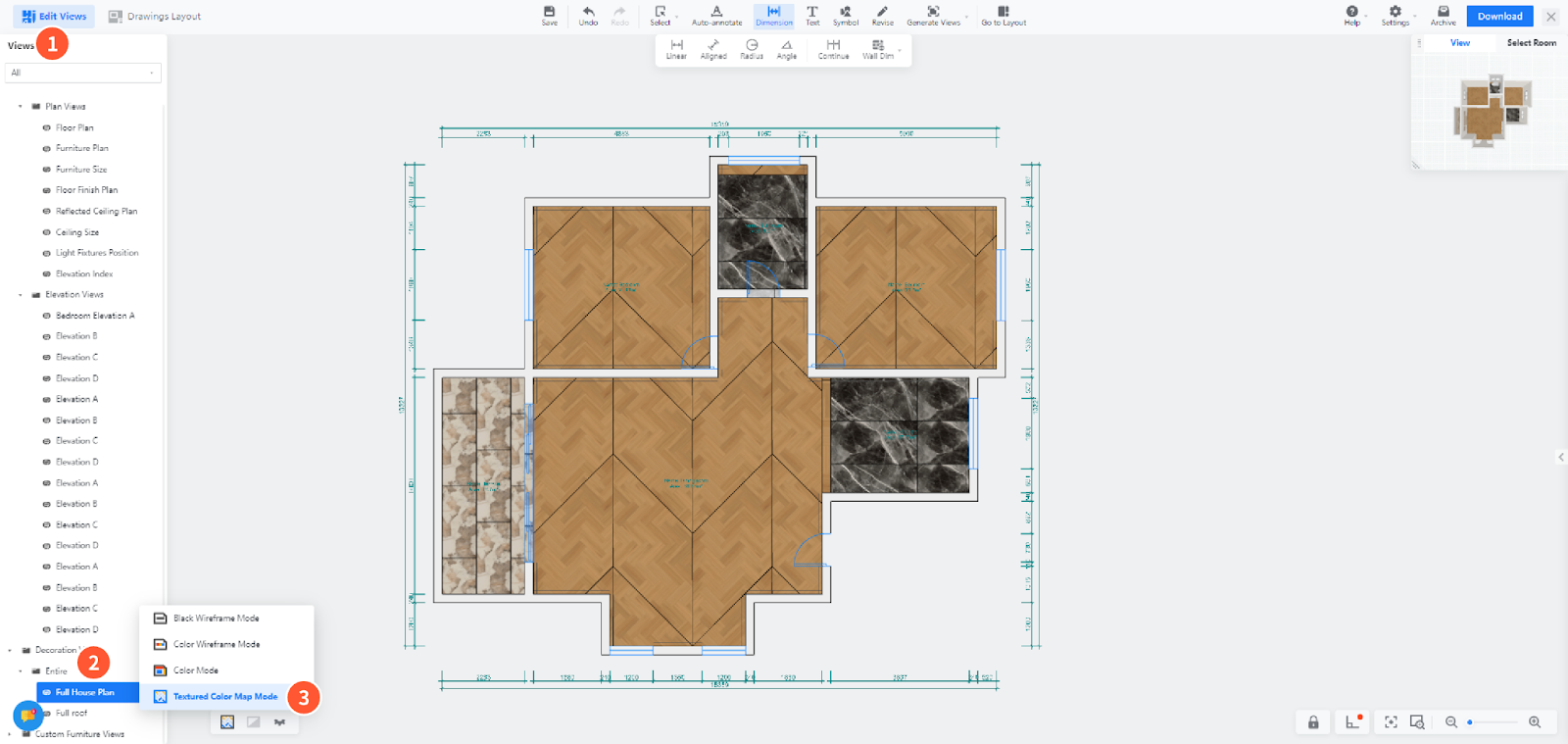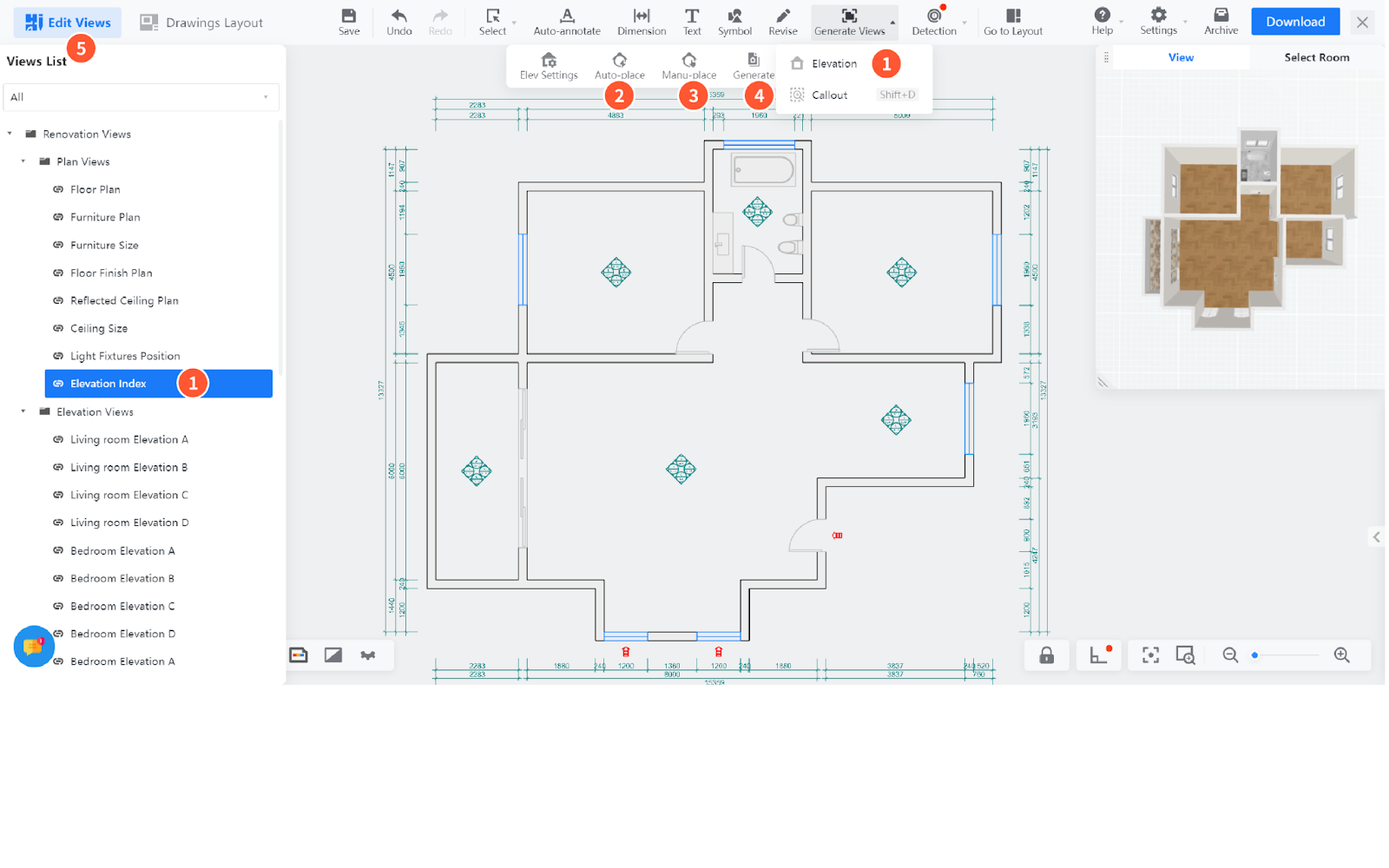 1 First, click on the elevation drawing button under "① Generate View" in the top toolbar, or click on the "Elevation Index" button in the left view list.