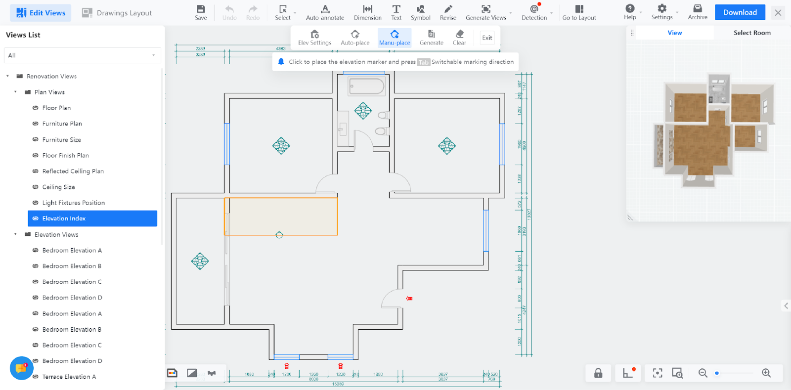 2.After that, you can either click on "Automatically Create Elevation Index Markers" or "Manually Create Elevation Index Markers."While creating index markers, you can also adjust the size of the elevation scope box to match the desired elevation drawing.