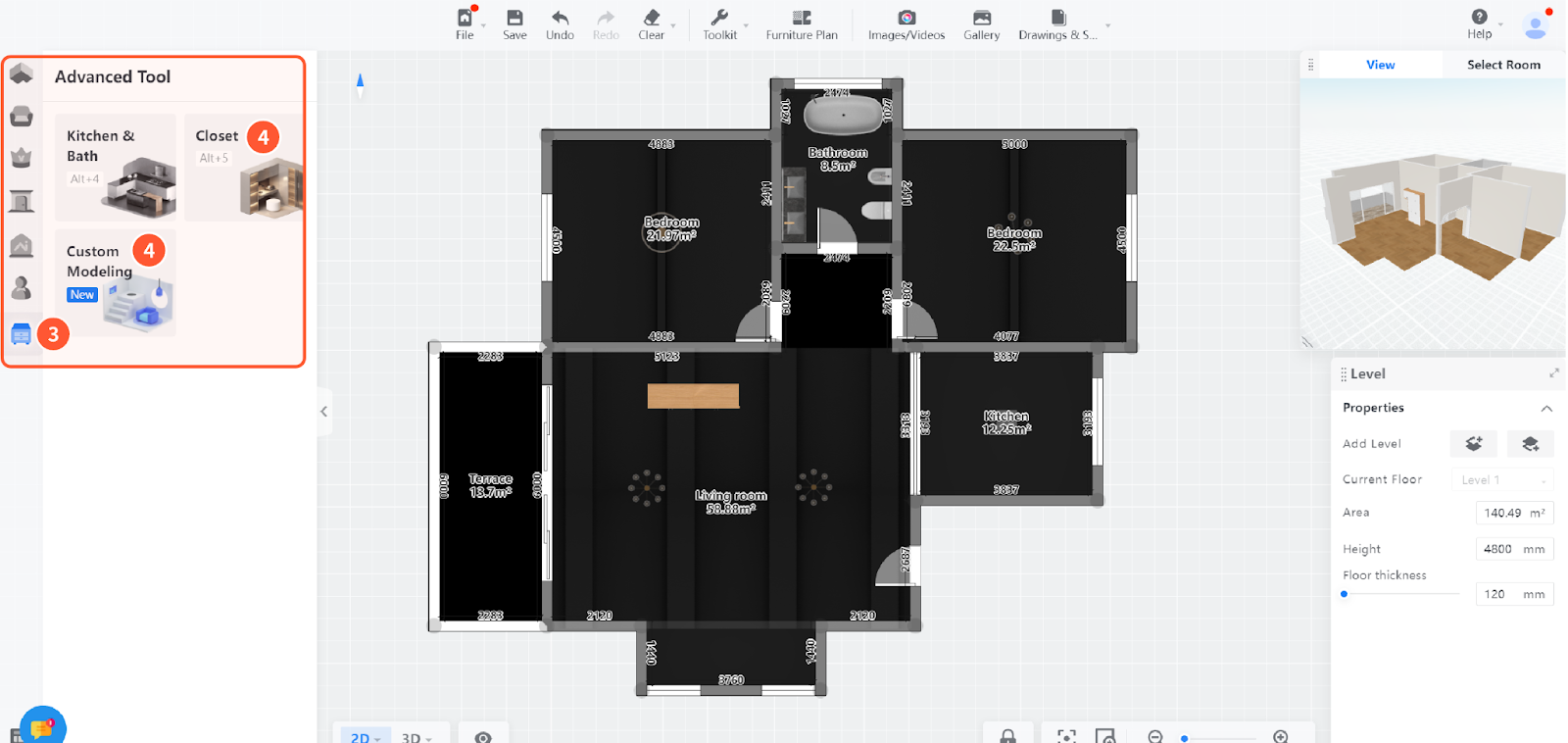 2.Click on the left sidebar labeled "③" to enter the industry library. Then, select the corresponding custom tool environment labelled "④" and complete the custom design.