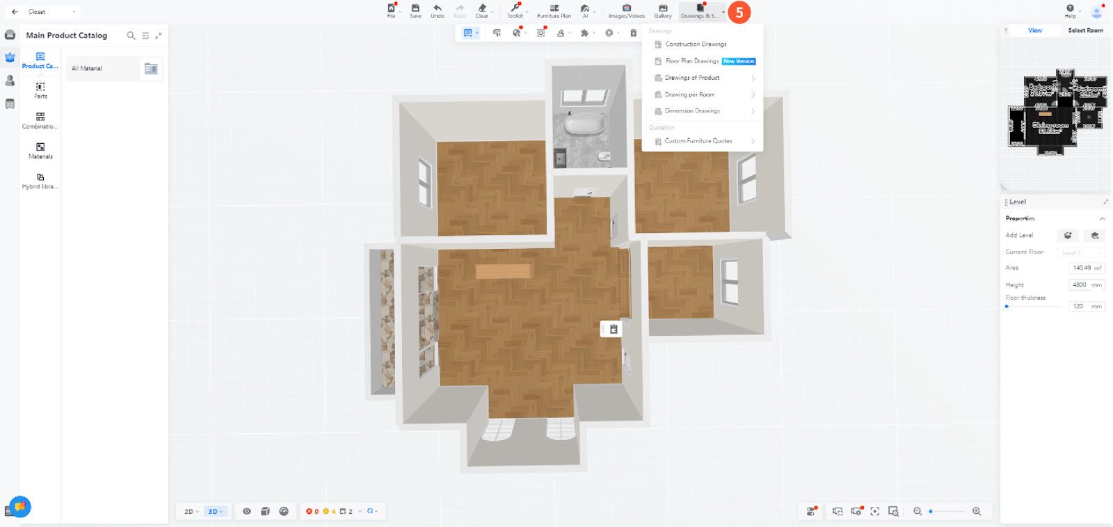3.After completing the custom design, click on the "Drawings & Lists" option labeled "⑤" in the top toolbar. From the dropdown list that appears, select the desired output method.