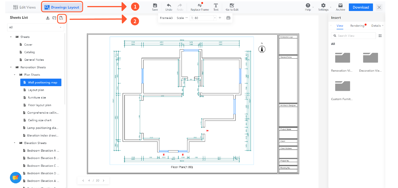 1.On the "Construction Drawing" page, click on "① Layout Paper". Select a certain paper from the list of papers, then click on "② Add Paper". The newly created paper will be generated below the selected paper.