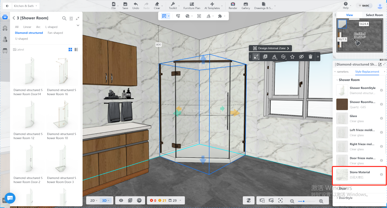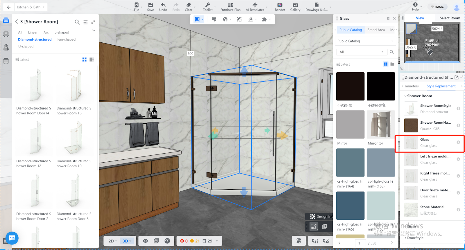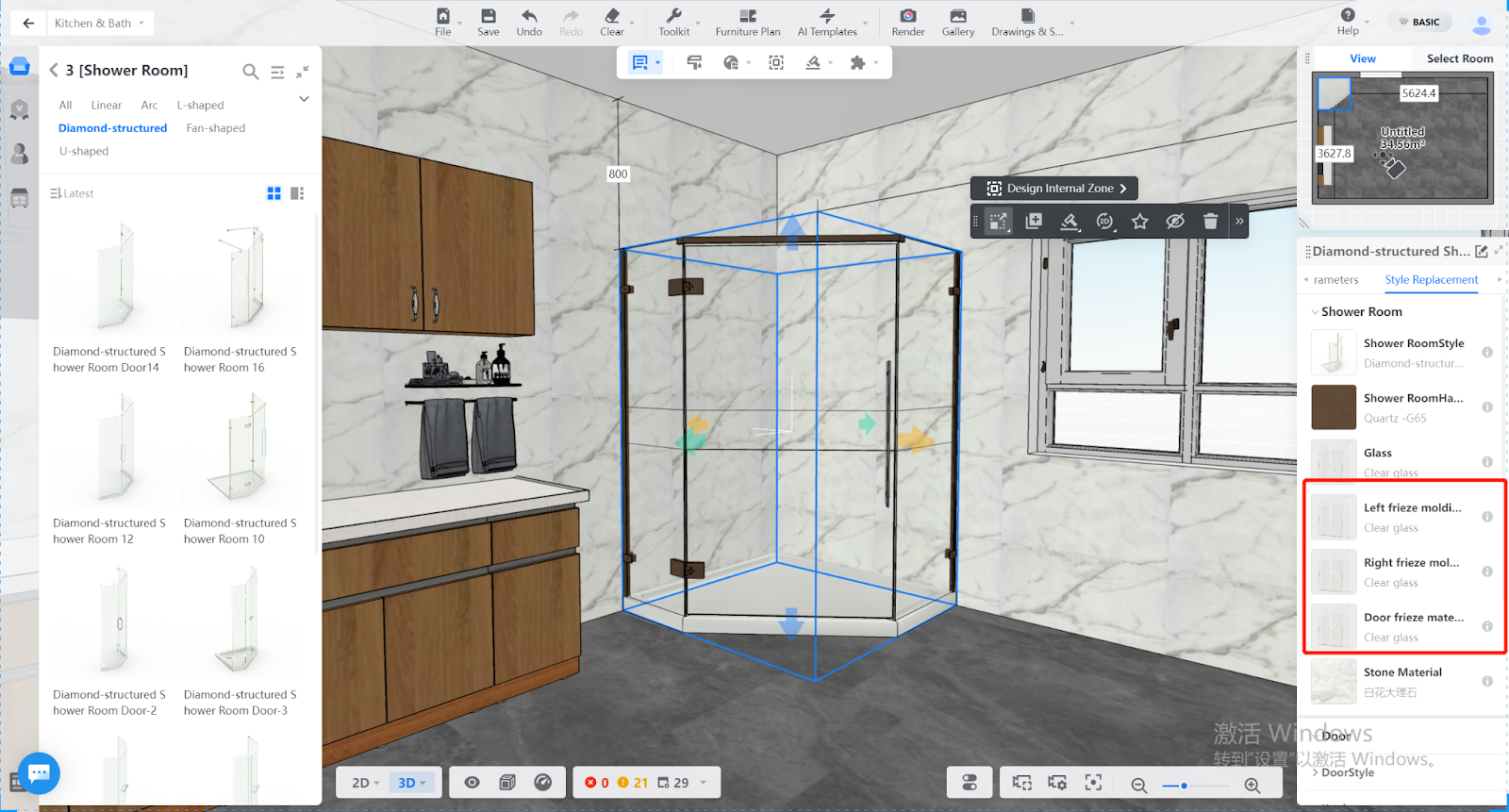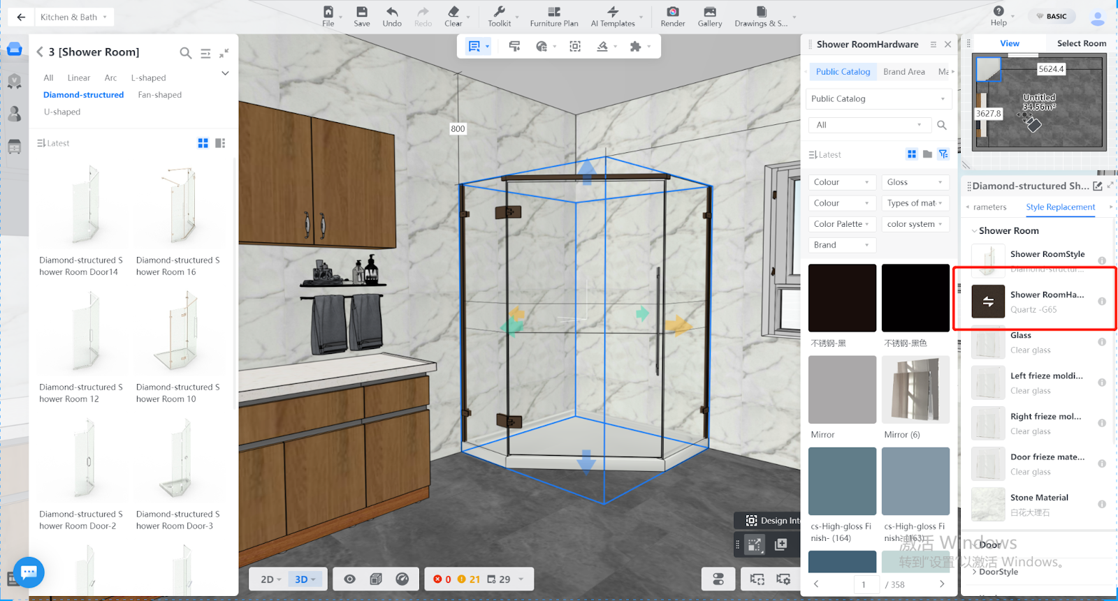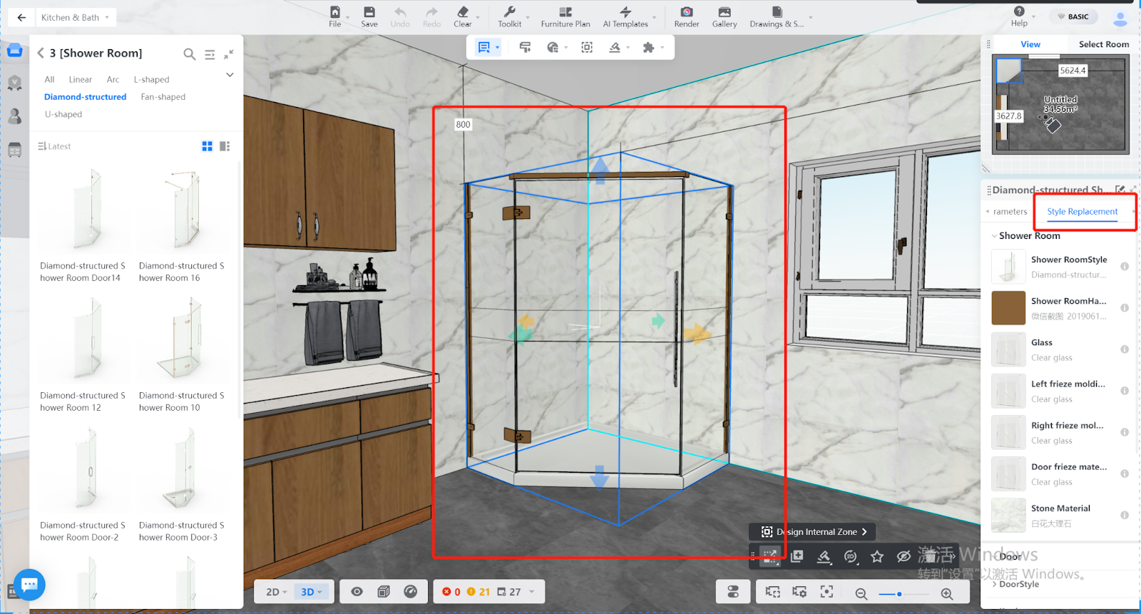 Step 2: Replace various components to personalize the shower room through style replacement settings.