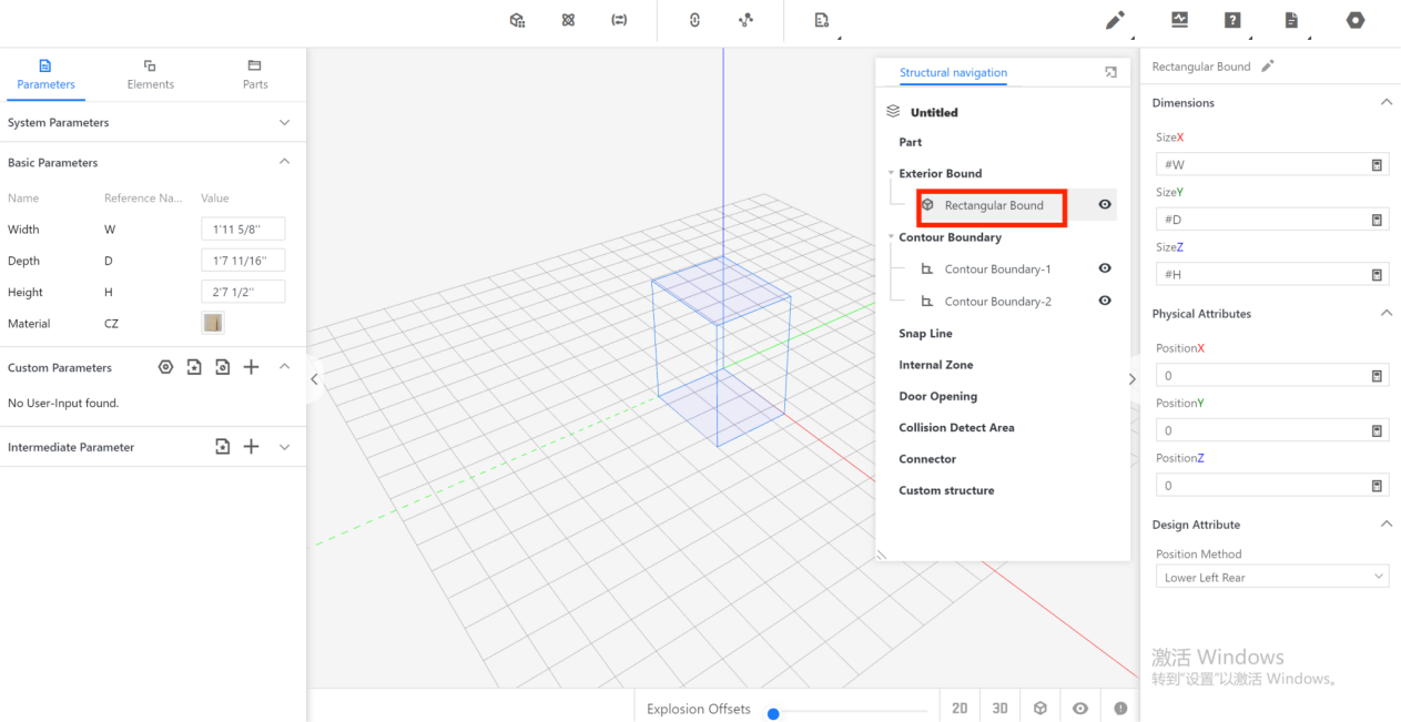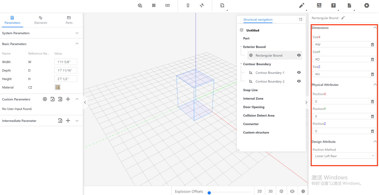 In cabinet mode, the model rectangular bound is used for snapping between cabinets, with the face of the model rectangular bound being snapped (the tool only recognizes the bound size, not the actual model size). In part models, the model rectangular bound is mainly used for adaptation, where the size of the model rectangular bound changes during adaptation.