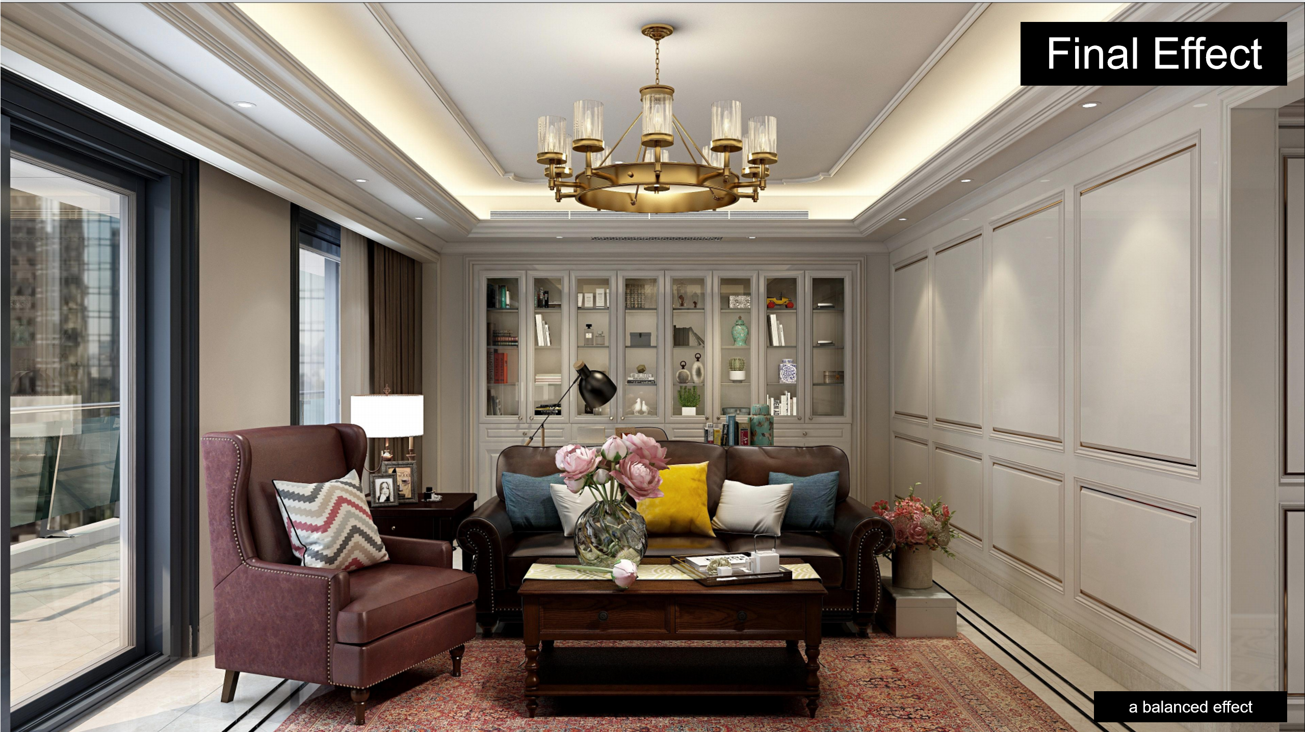 Add up omni light to strengthen and create a spherical light effect. The diameter of the spherical lamp can be close to the size of the chandelier, and the brightness is between 250-300, between the chandelier and the ceiling. The color temperature can be warmer.