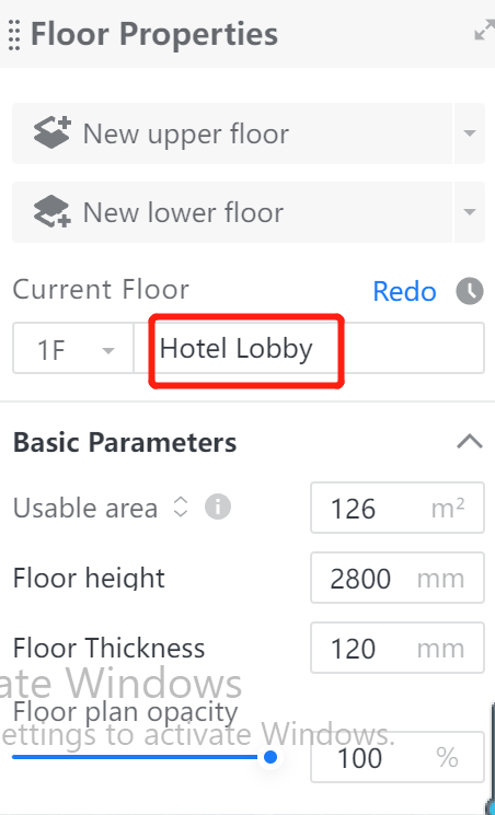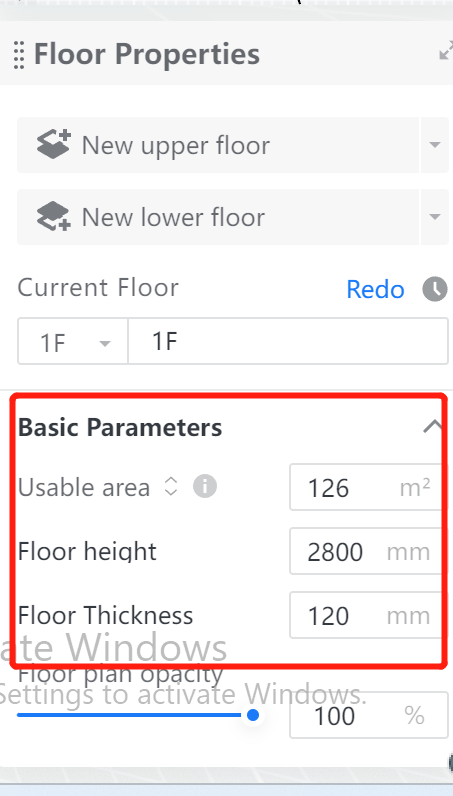 Interior Area: Set the interior area value of the current floor, and the floor plan in the canvas will be scaled proportionally.