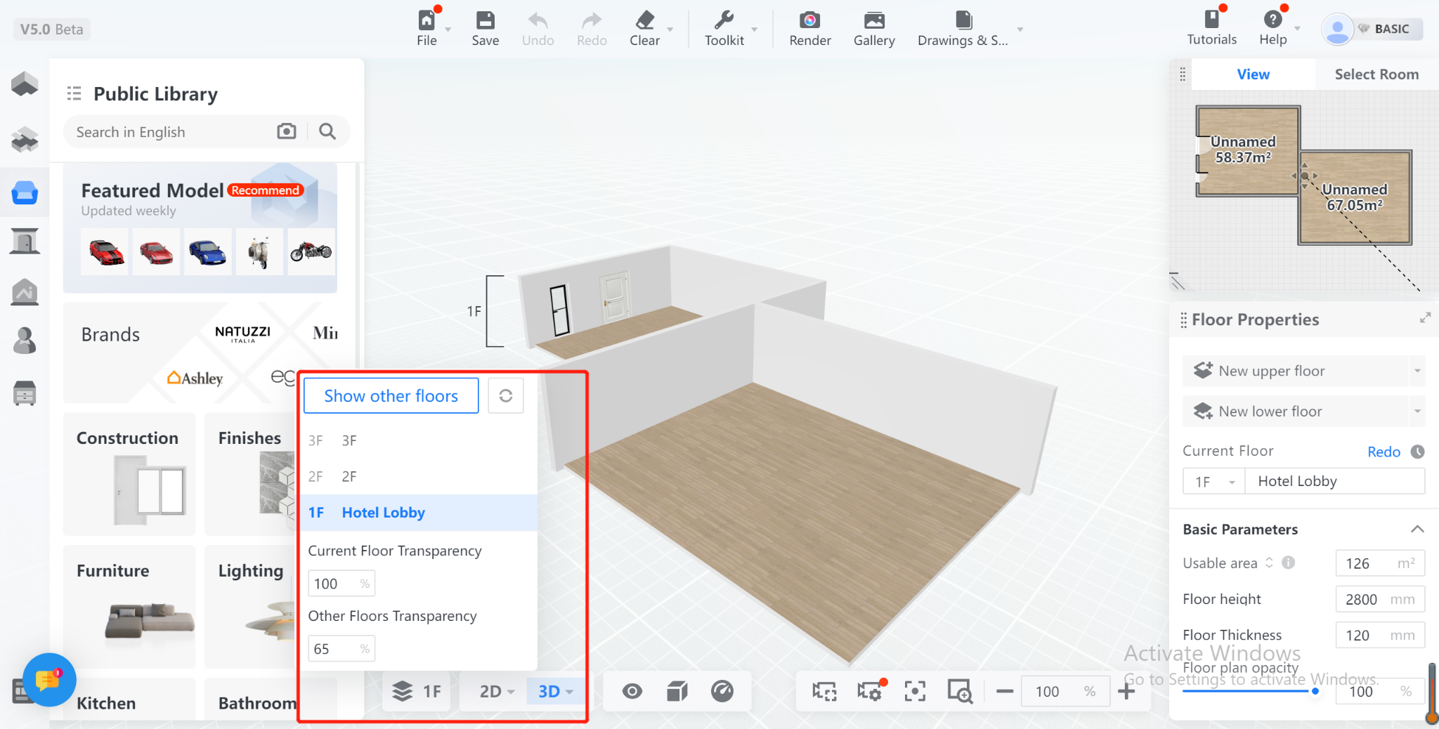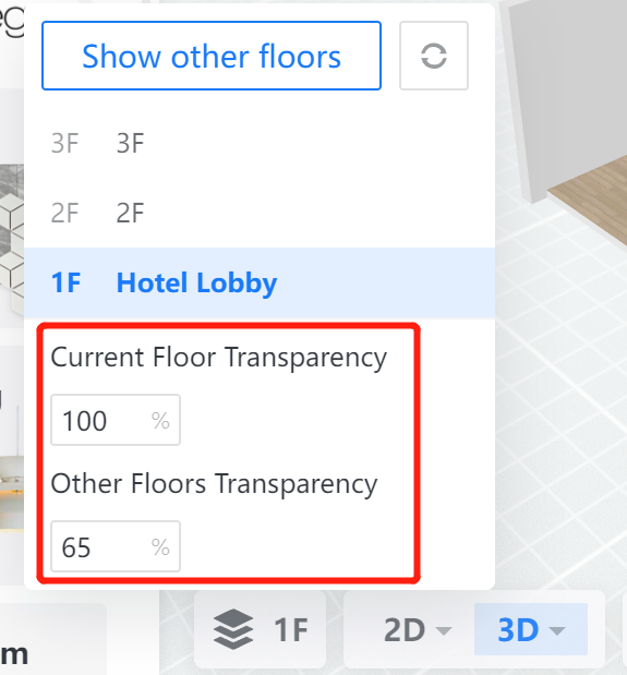 The opacity of the current floor and other floors can be separately set. The opacity of the current layer can simultaneously control the transparency display effect of 2D and 3D.