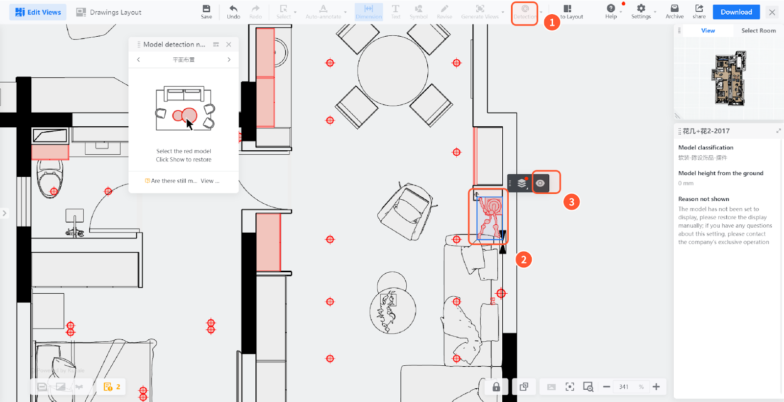 VII.I placed models outside the house, but they are not displayed in the construction drawing. What should I do?