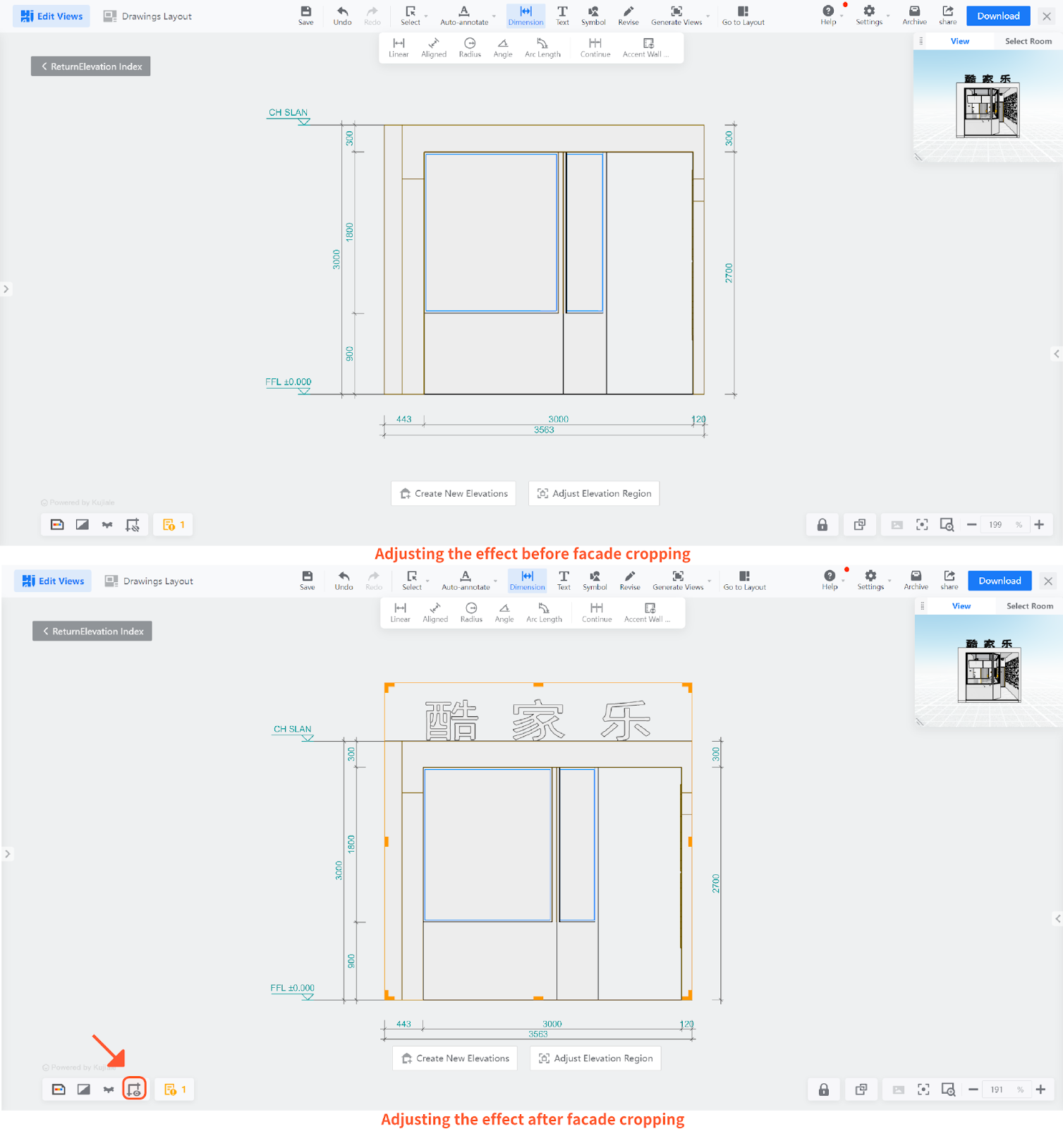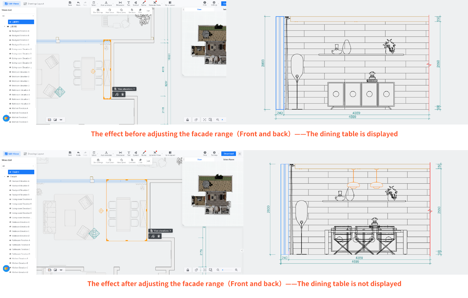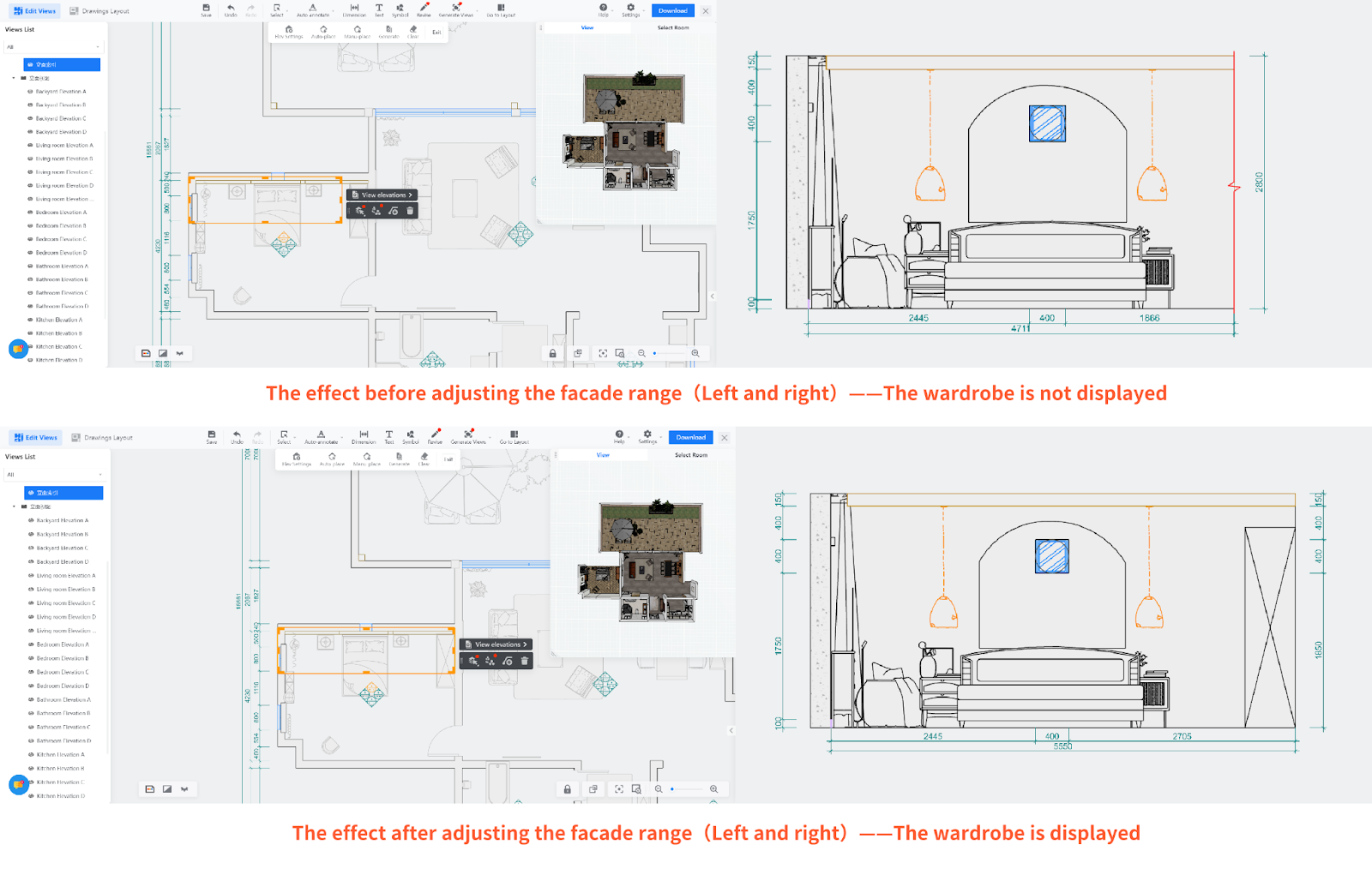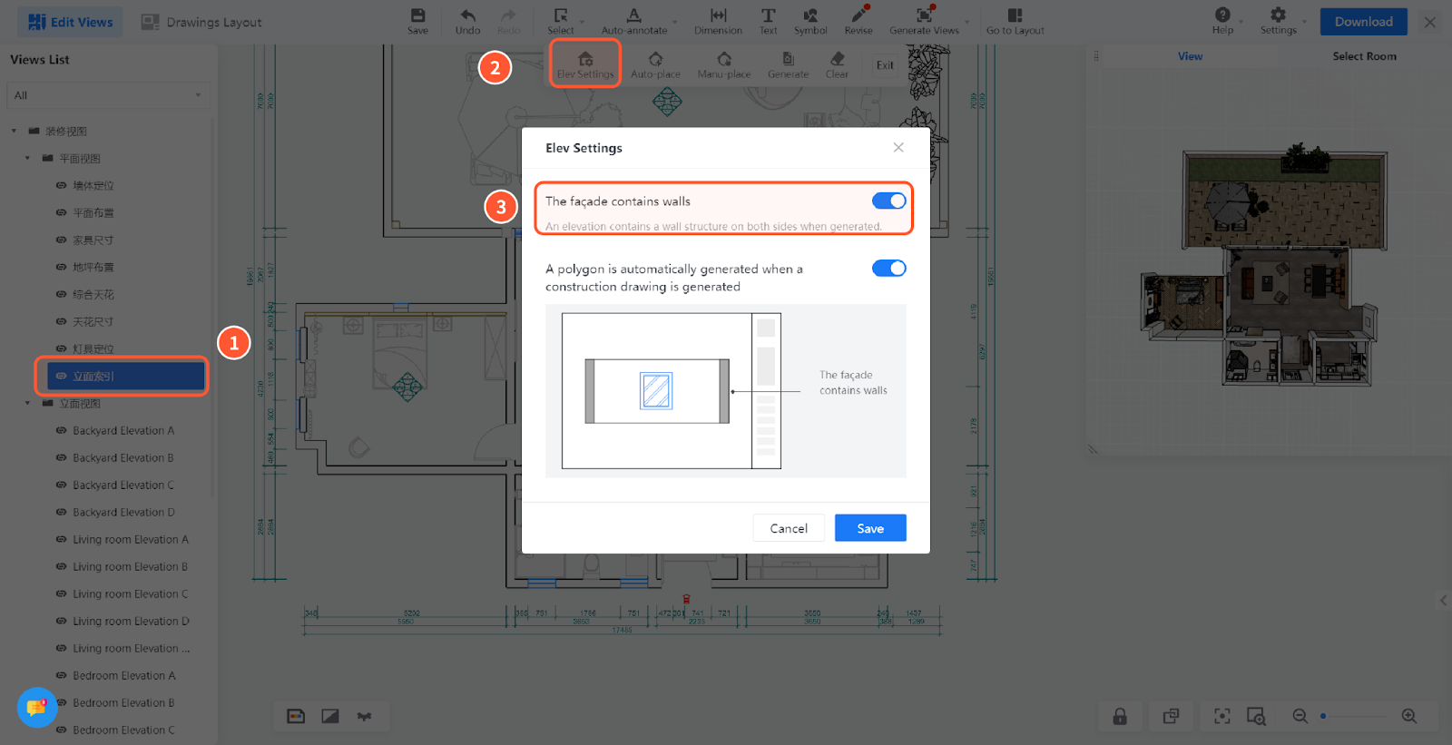 Enter the "Elevation Index" view, click on the "Elevation Settings" function at the top of the page, and toggle the "Include Walls in Elevation" switch.