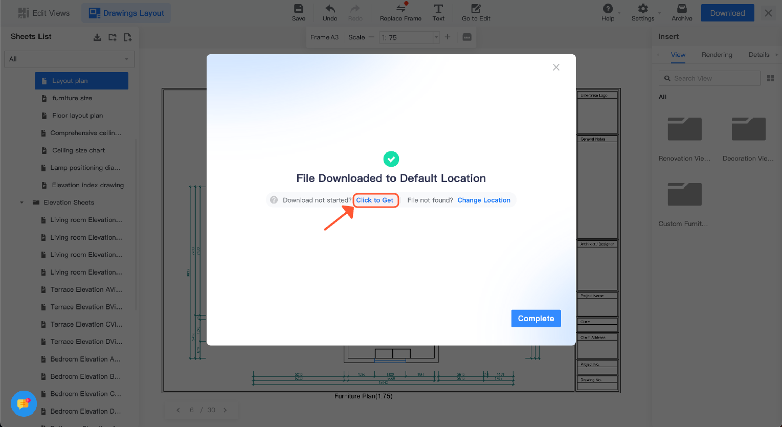 Return to the Coohom construction drawing page and refresh the webpage as prompted to start the download again.