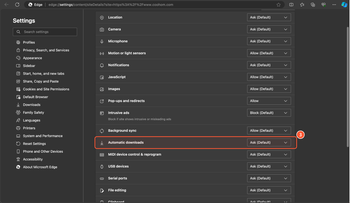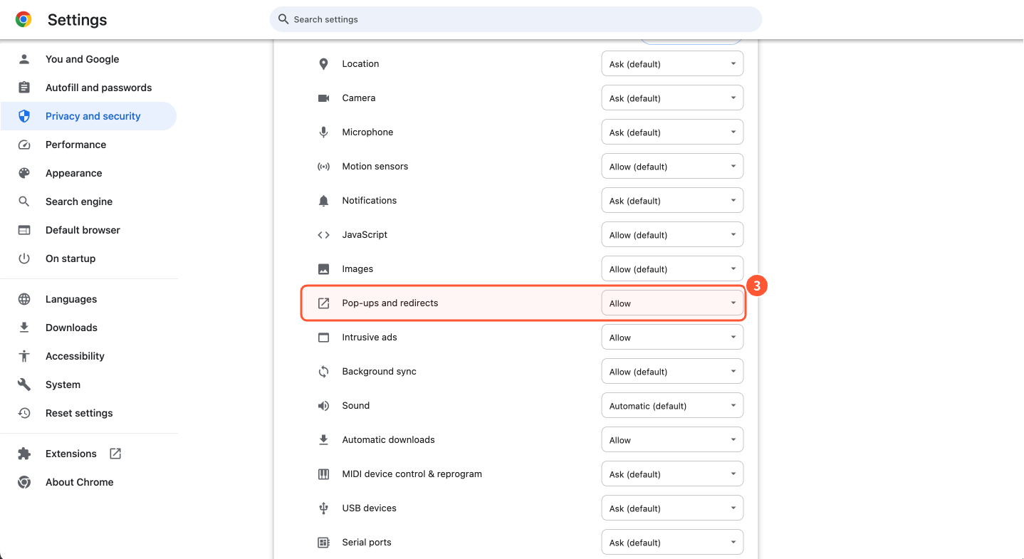 On the settings page, locate ③ "Pop-ups and redirects." If the option is set to "Block," switch it to "Allow."