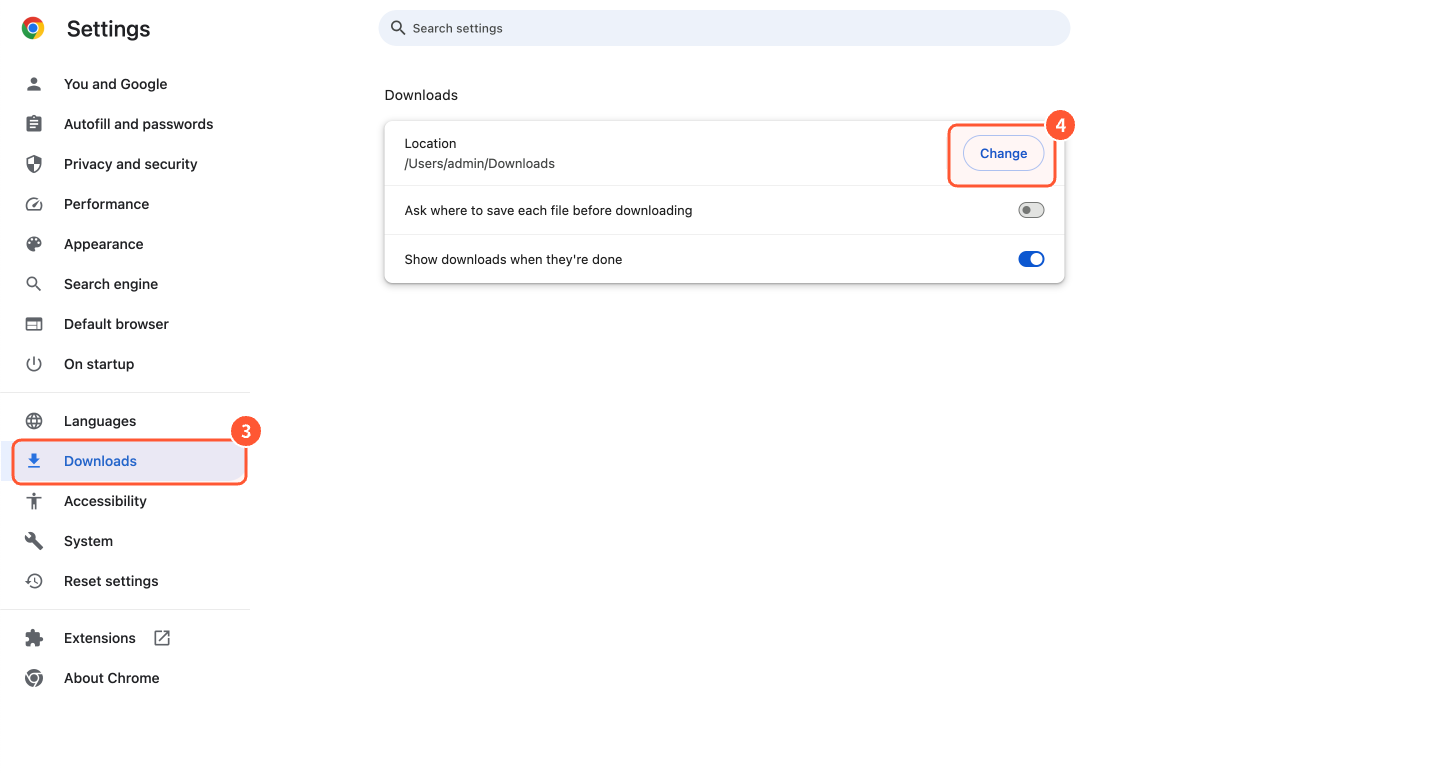 On the left, find ③ "Downloads", then click on the ④ "Change" button to switch the save location.