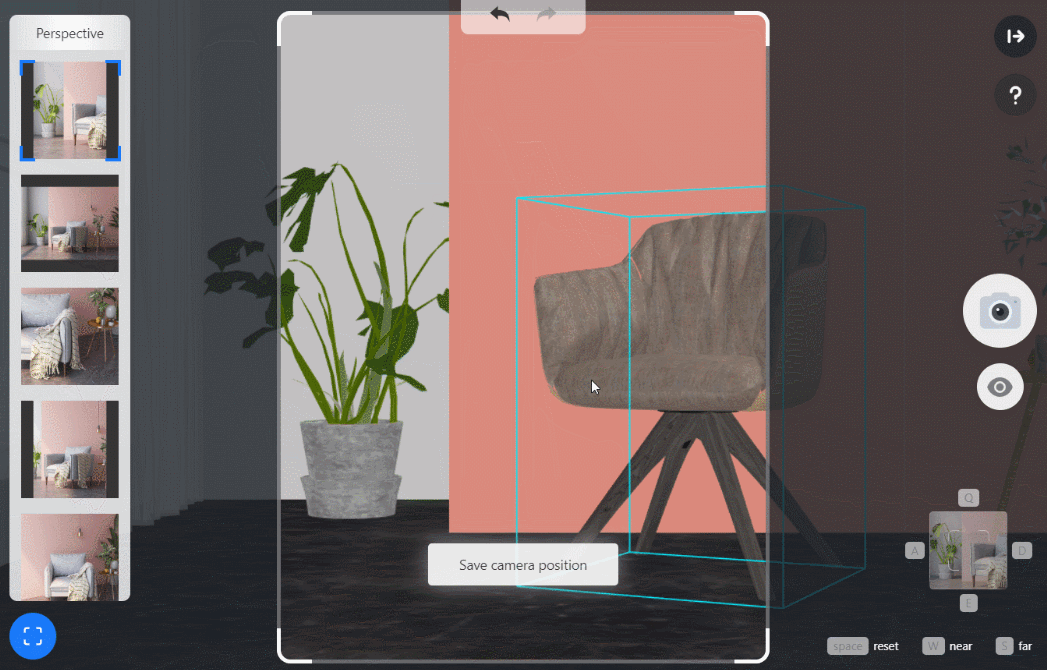 3. Press WSAD to adjust left and right, QE to adjust up and down, space is to reset. Click "save camera position" to save the adjusted angle.