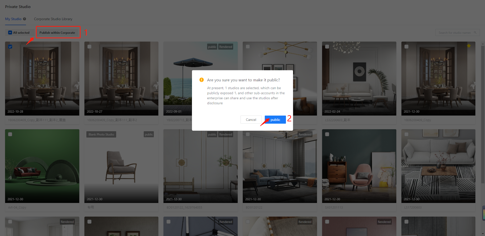 As you may notice, a “public” tag is on the studio thumbnail, indicating that the studio has been published to the Corporate Studio Library and the sub-account users above a certain permission level can have access to it.