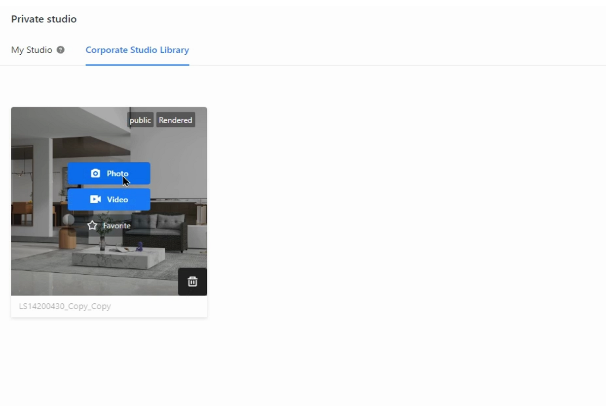 6. If you want to delete the studio, simply move your mouse to the bottom-right corner of the thumbnail and click the trash bin icon.