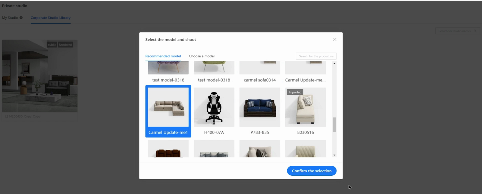 If you want to take a photo shoot right away in the studio scene, click the Photo button. Then, select the product model that you want to shoot and confirm.