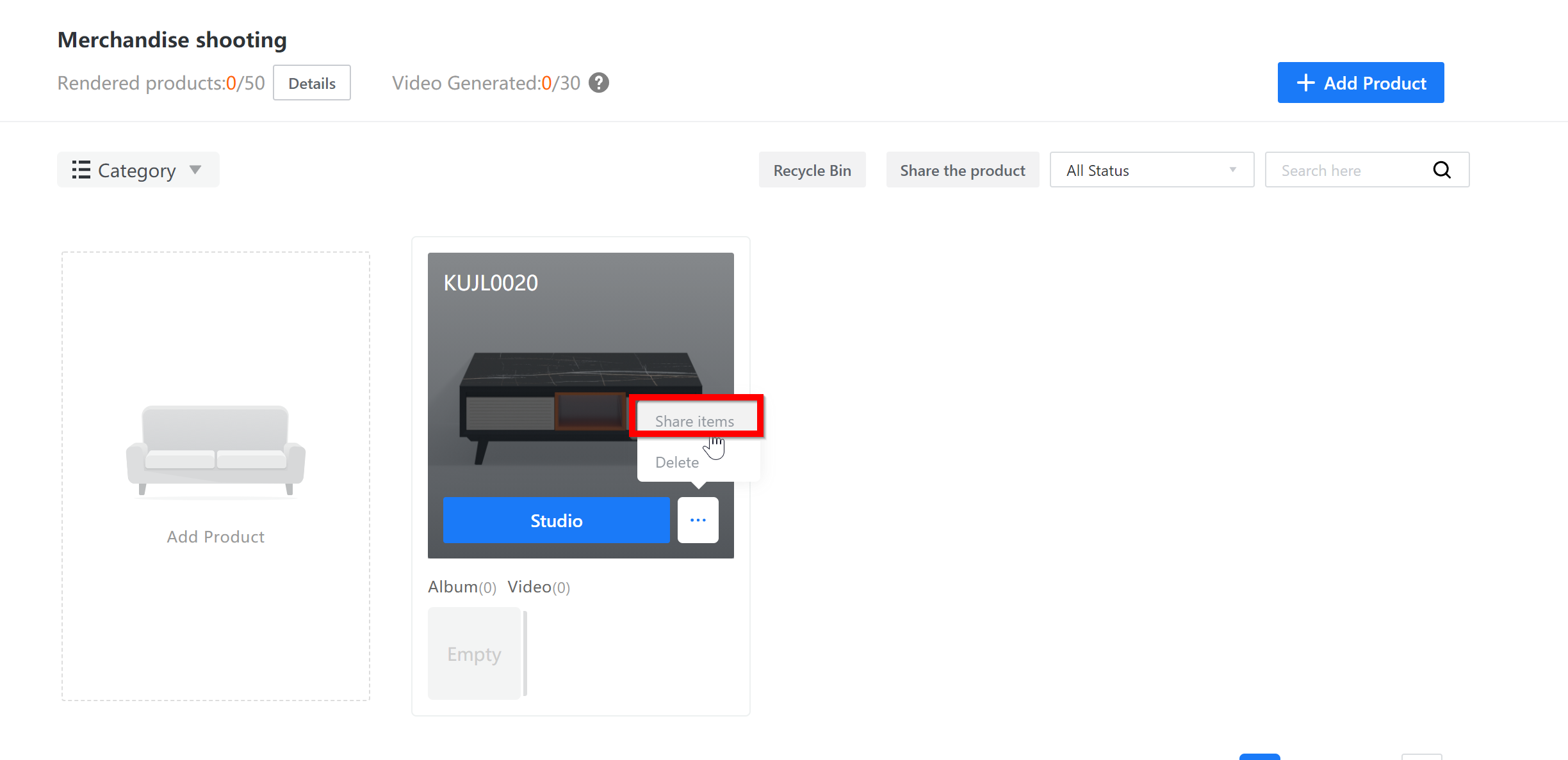 Original scenario —— Among the accounts under the enterprise, if account A adds a studio shot product to his photo studio section, account B cannot shoot the photos/video for this product.