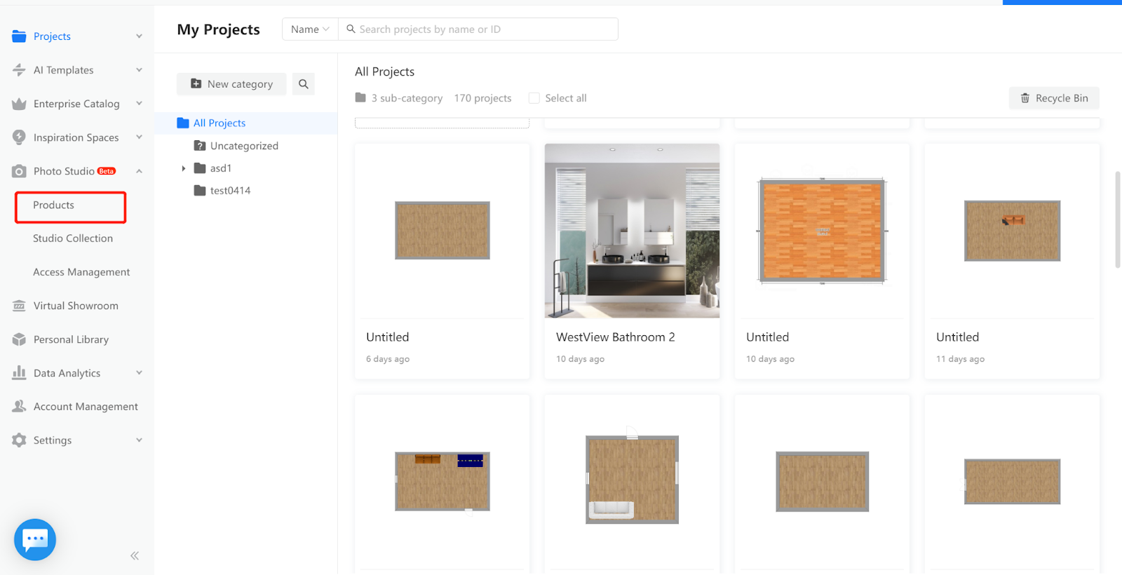 1. Log into your Coohom enterprise account. In the left-side navigation pane, click the Photo Studio icon. In the drop-down menu that appears, click on Products.
