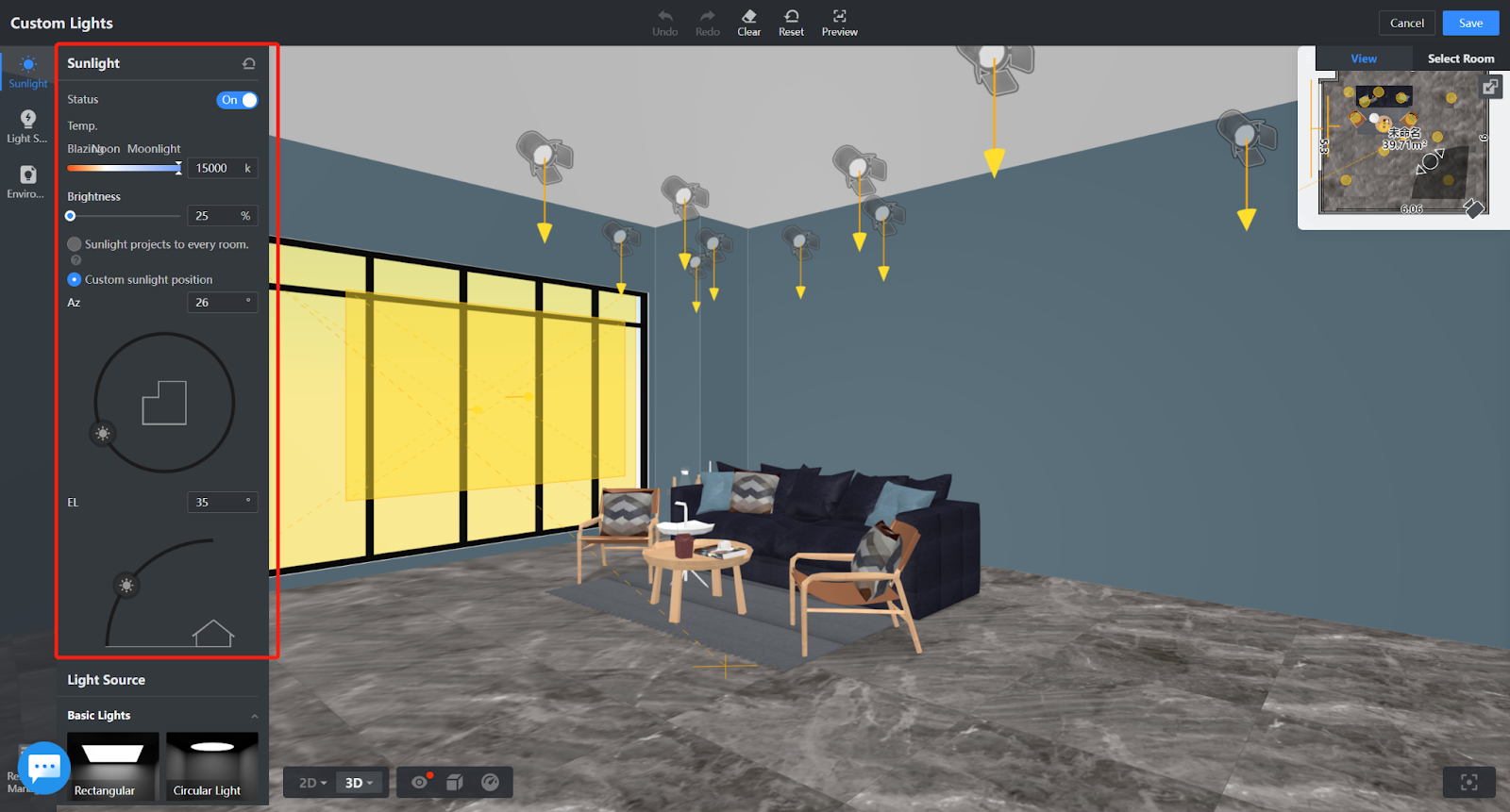 The lighting adjustment features of the Dimming Tool are similar to those in the design tool. They both support adjustments of Sunlight and Light Source. However, the Dimming Tool includes more than that as it offers the Environment section that allows you to add and edit images of outdoor scenes for your studio.