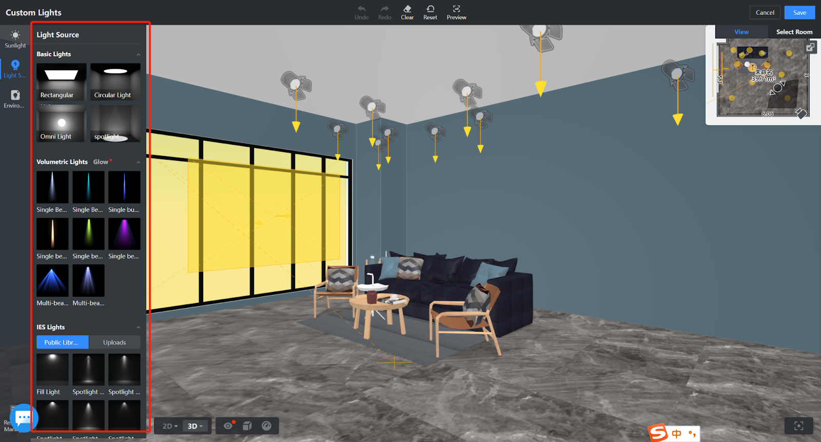 IES Lights: You can select light sources of this type from the public library. You can also upload your own IES lights.