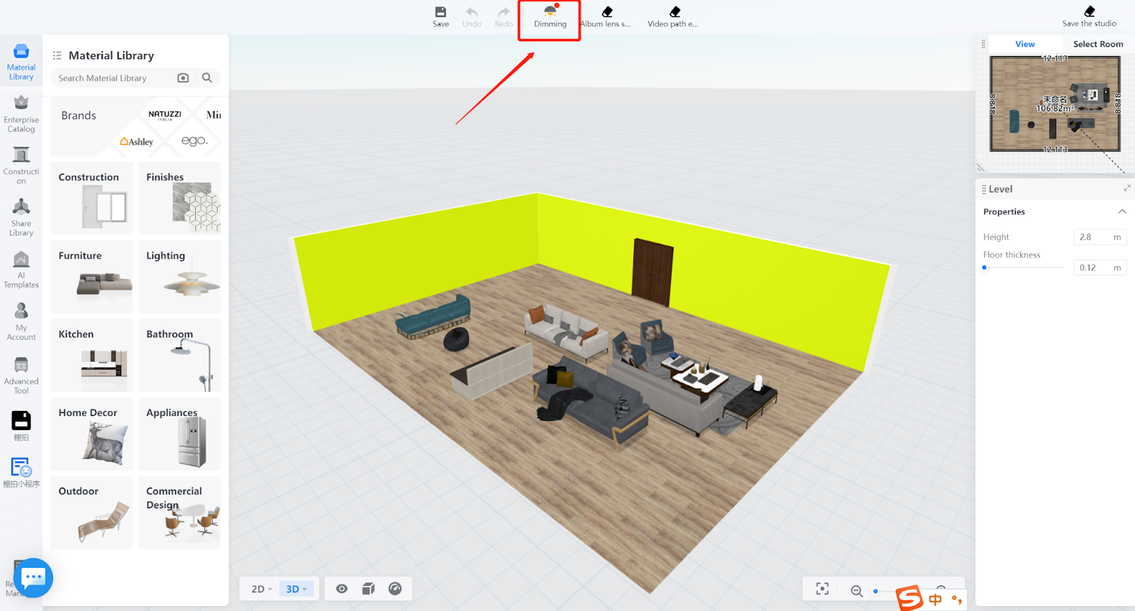 5. On the interface for studio editing, click Dimming on the top bar to start using the lighting adjustment tool.