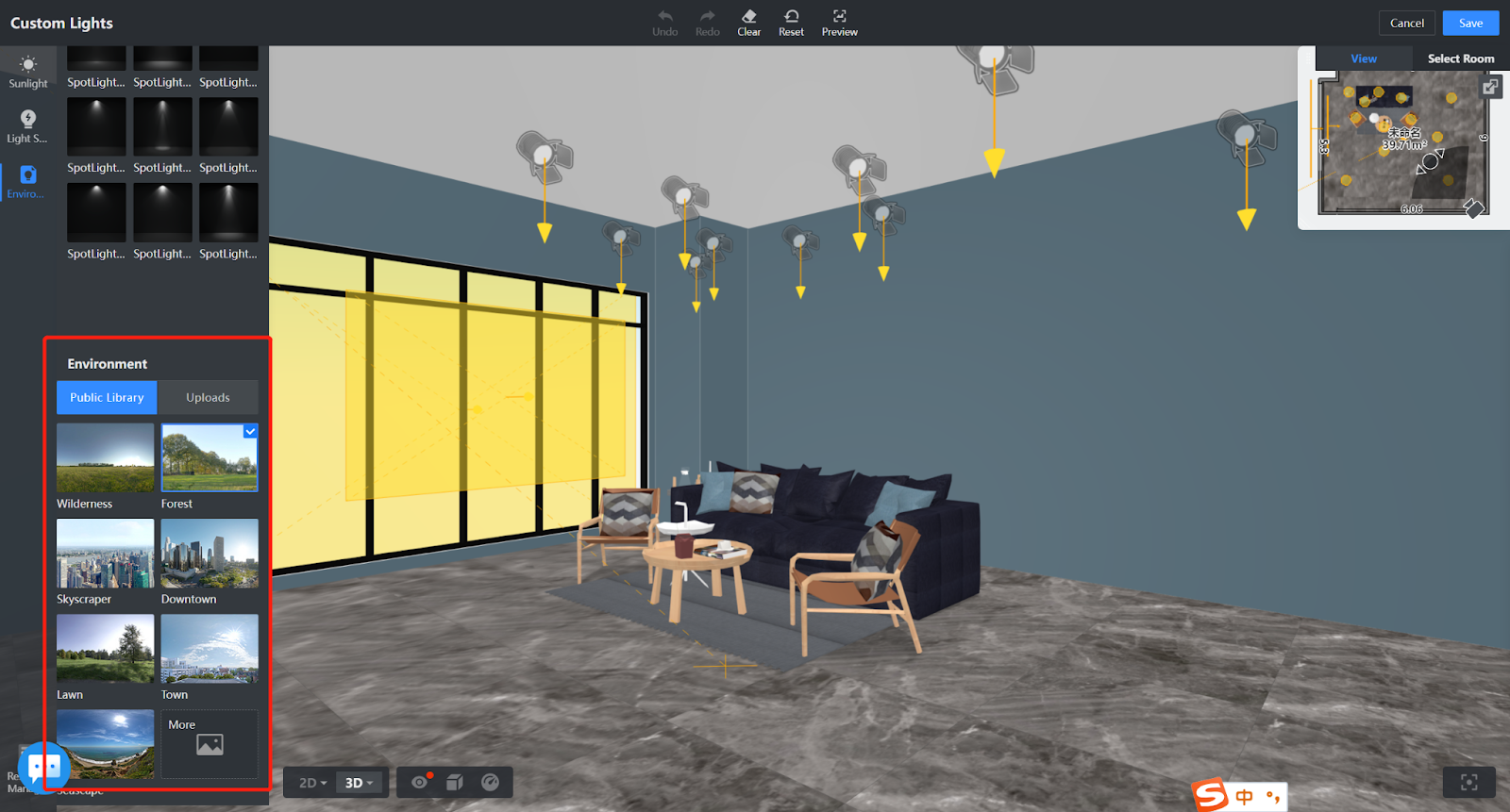 In the Environment section, you can select images of outdoor scenes from the public library or simply upload images of your own. After that, you can edit the images as needed.