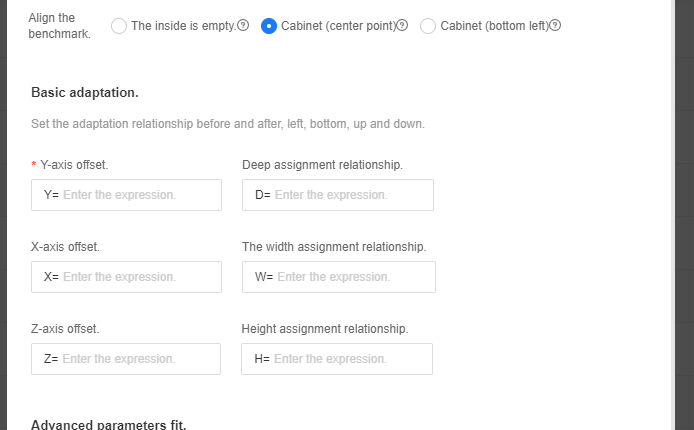 The second method: align with the cabinet body (center point) as the reference, which means that the cabinet body will be found according to the inner space during the adaptation process, and then according to the set component center point coordinates (X, Y, Z) and Align and offset the relationship of the center point coordinates of the cabinet (0,0,0)The third method: align with the cabinet body (left rear bottom) as the reference, which means that during the adaptation process, the cabinet body will be found according to the inner space, and then according to the set component left and bottom coordinates (X, Y, Z ) Align and offset the relationship between the bottom left and bottom coordinates of the cabinet (0,0,0)In the second or third method, you can enter the specific board coordinate values (x, y, z) in the front, back, left, and right directions to determine the precise positioning of the component when it is adapted to the inner space, and enter the specific main parameter expression (or value) to determine the specific size of the component