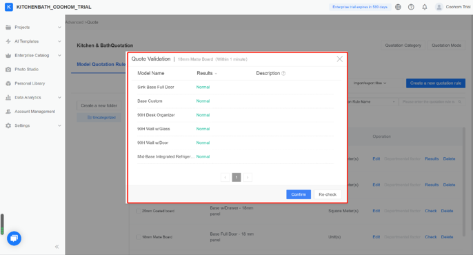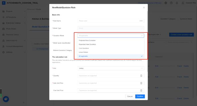 At Coohom, quotes are created by rules. A quotation rule is made up of quotation mode, model and material quote categories, and calculation rules. One you set the rules, the price quotation will be calculated automatically. The quotaion will appear in the project and vary with sizes and materials of products in real time.
