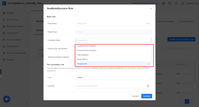 For now we support at least three kinds of frequently used quotation modes: extended area quotations, projected area quotations and linear meters, etc. Enterprises are able to modify quotations to their needs, such as the cost price.