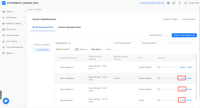 Create a quotation category. When you edit a quotation, apply the category to a product, then the product will be assigned a rule. There are three kinds of quotation categories: Model Quotation Category (parametric models), Contour Quotation Category (such as crown molding, toekick, etc.) and Material Quotation Category.