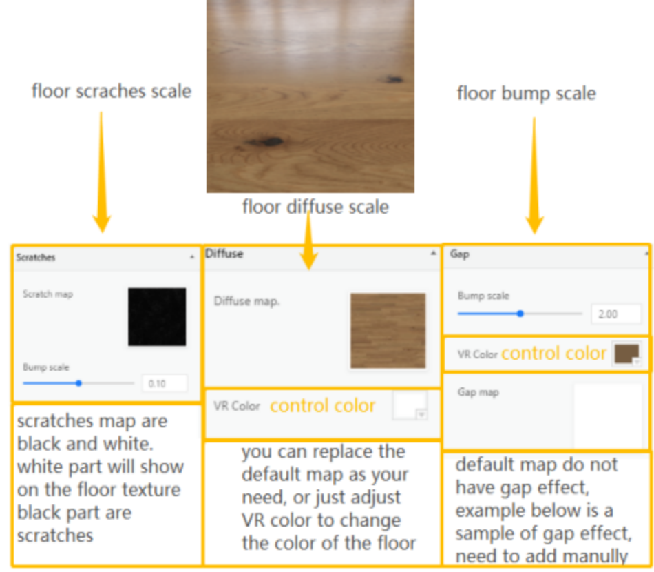 Adjust diffuse map and add VR color.When using default map, adjust VR color will change the floor color.(Size not exceed 5M, resolution not exceed 5000pixels)