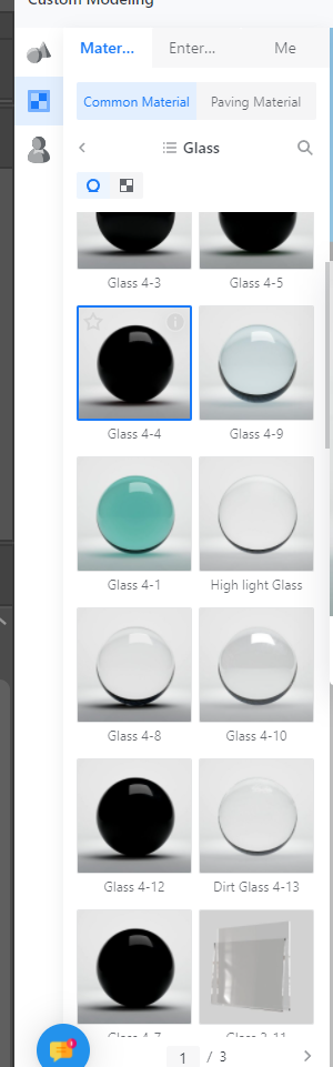 Additionally, all materials need to be assigned within the custom modeling function. You can select the glass material according to your needs, such as by its color, smoothness, translucency, or transparency. Different types of glass materials will also have varying effects on the lighting of the light.