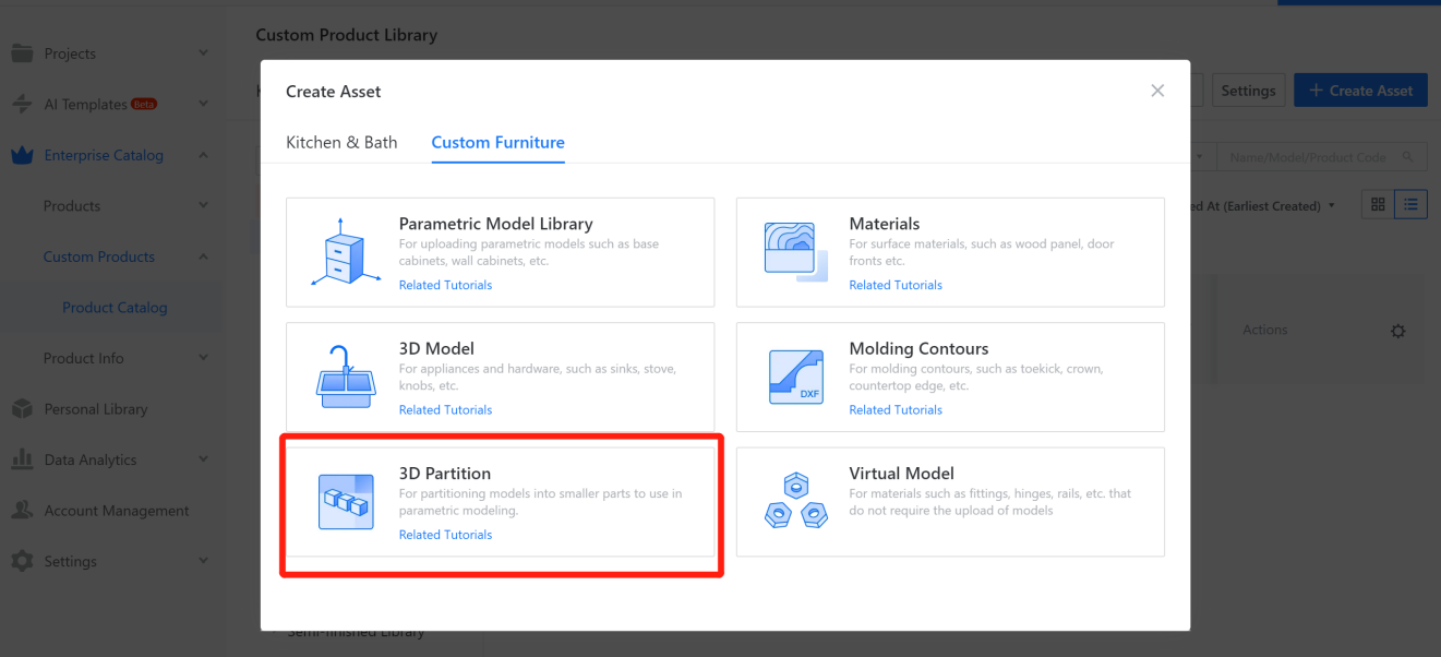 The 3D model partition tool is a tool that cuts the model into smaller modules, which facilitates the conversion of the original model into a parameterized model during the parametric modeling process. It can only cut 3D uploaded models.