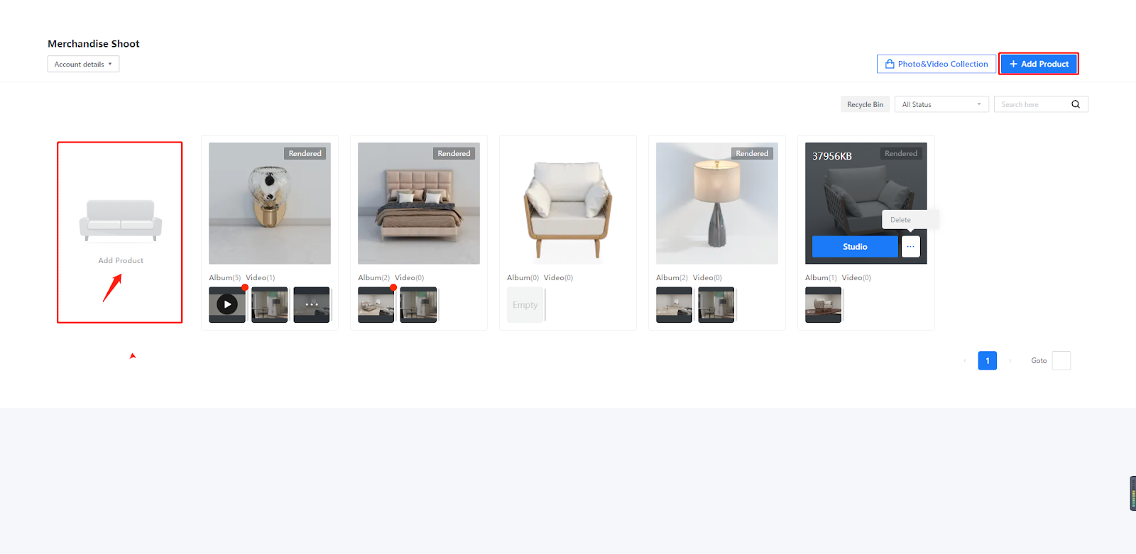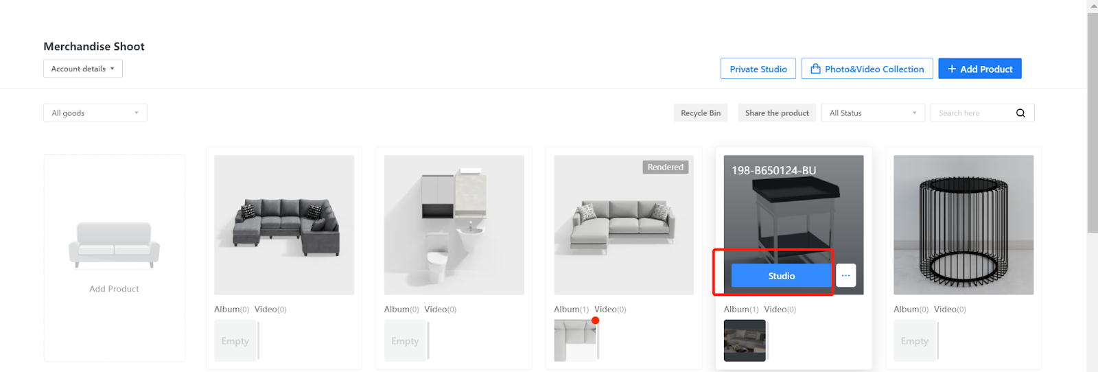 Move the cursor over the product that you have added or shot photos/videos for. Then, click the Studio button.