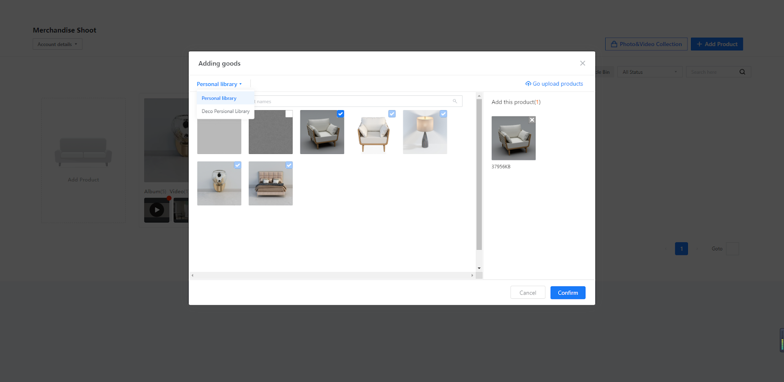 When you add products for shooting in the pop-up window, you can select one or multiple products at a time for shooting.