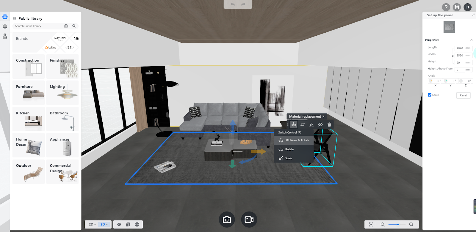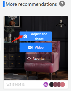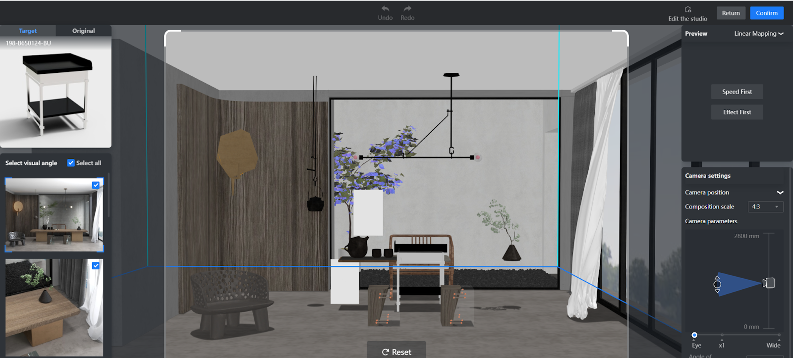 If you want to edit the studio before shooting, click on Edit the studio button near the top-right corner of the page. Then, you can replace and add products, substitute materials and textures of products as well as change product positions. Besides, you can edit interior finishes such as the wall, floor and ceiling.