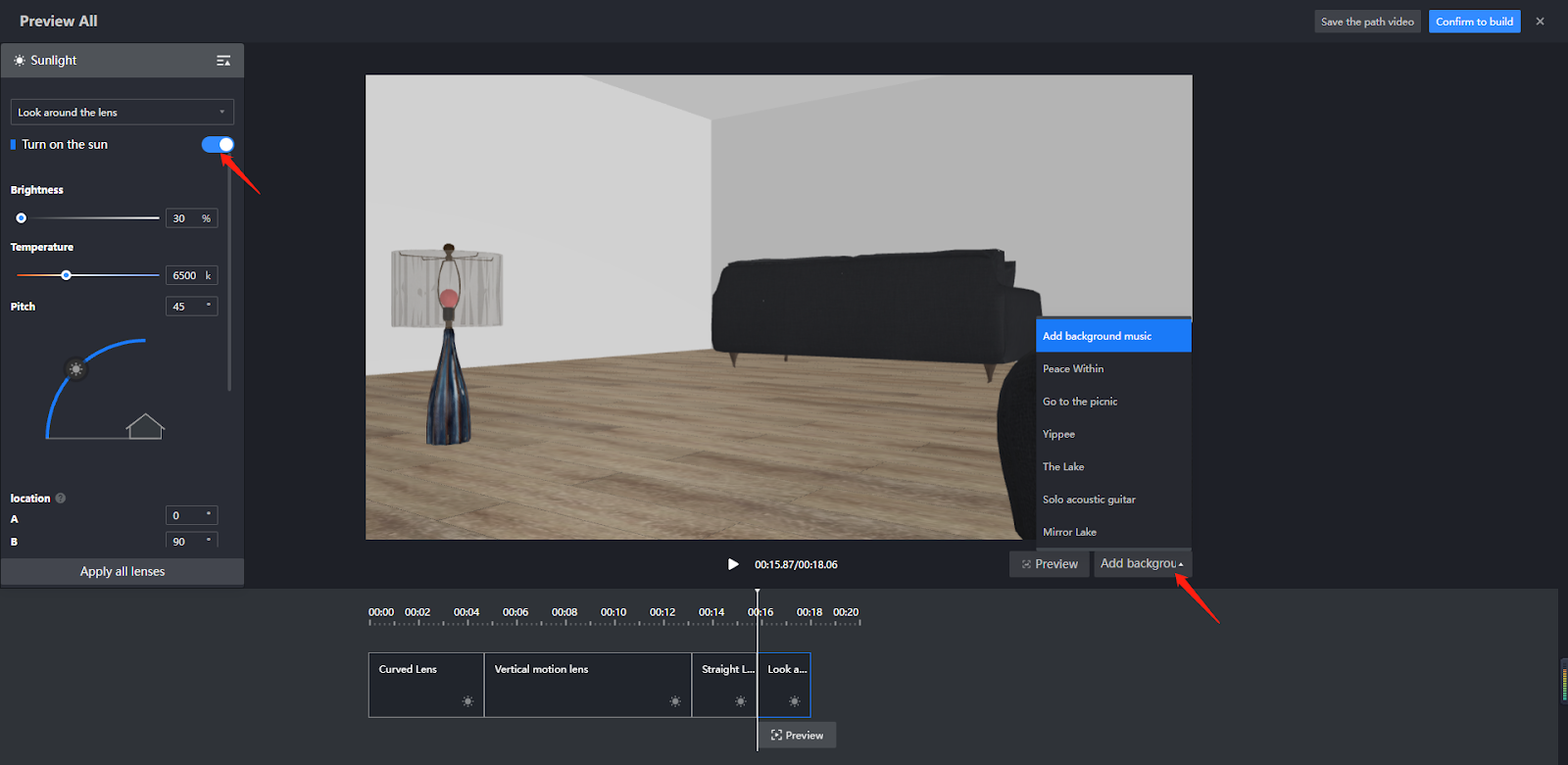 If you choose this option, you can edit the camera path for your video by adding 4 types of lenses.