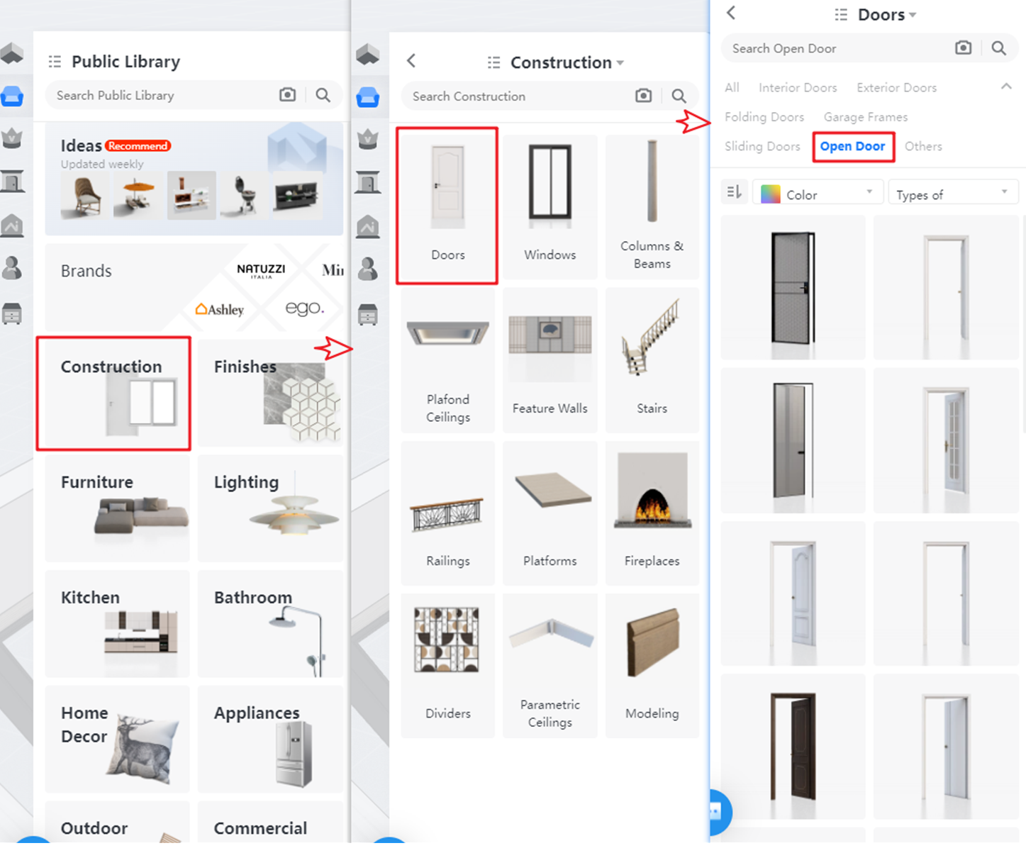 First, you need to find Open Door models as per this route: Public Moldel Library - Construction - Doors - Open Door.