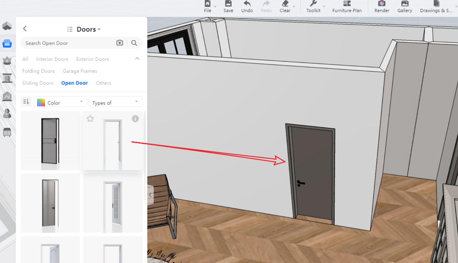 Second, you can drag the Open Door model over to the existing door model on the wall in the project.