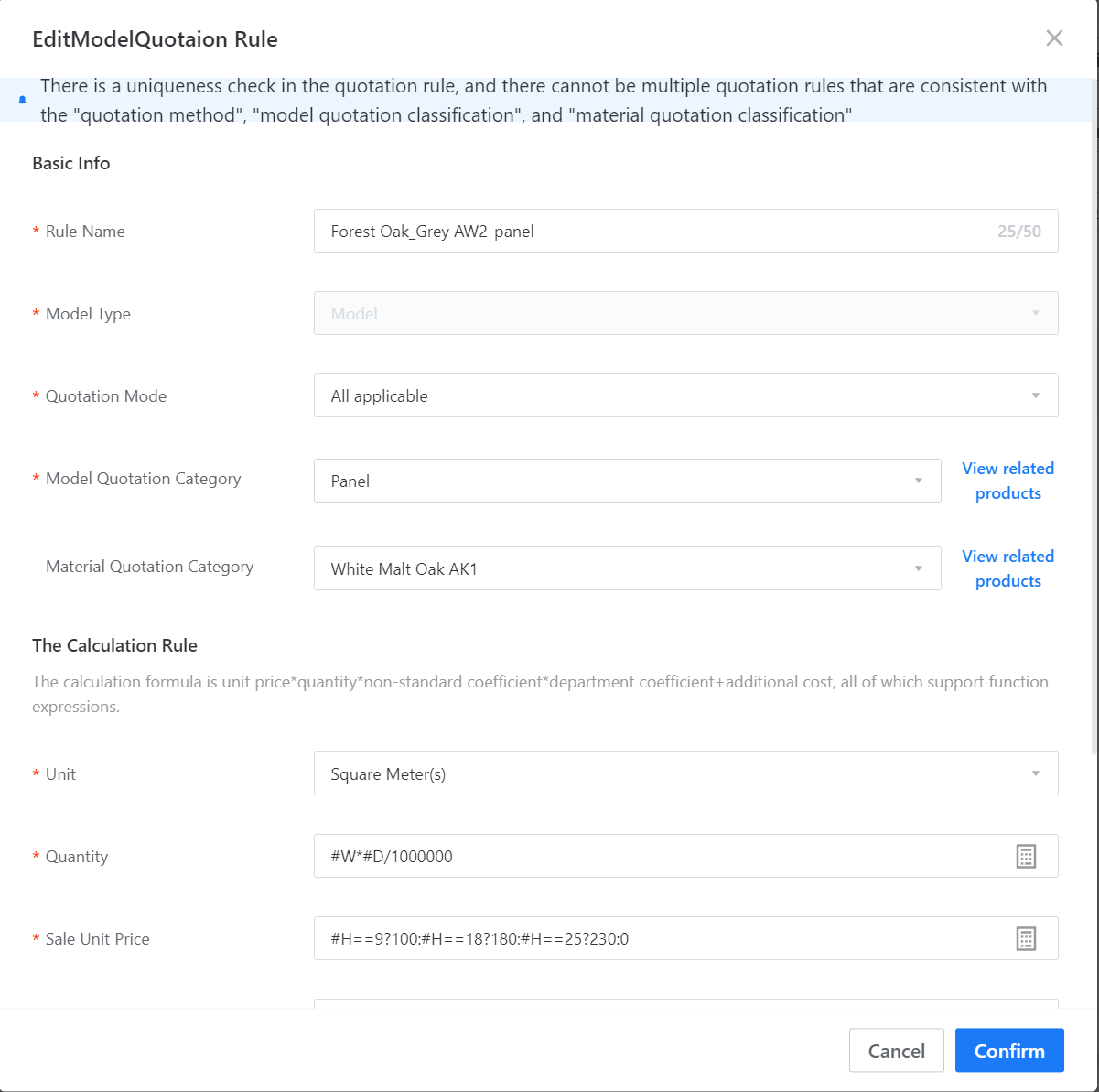 2.Define the quotation rules for the panel in the pop-up window. The options marked with “*” are required fields. Material quotation categories are optional. If the quotation does not need to change according to the material, you can skip this step. In this example, there are two material quotation categories. In practice, you should create a quotation rule for each type of material quotation.