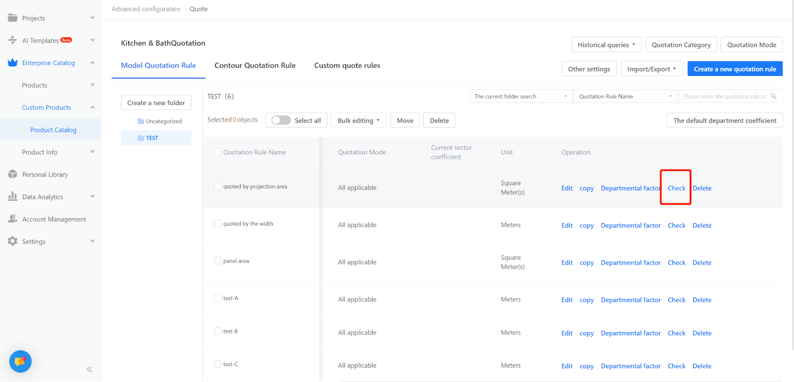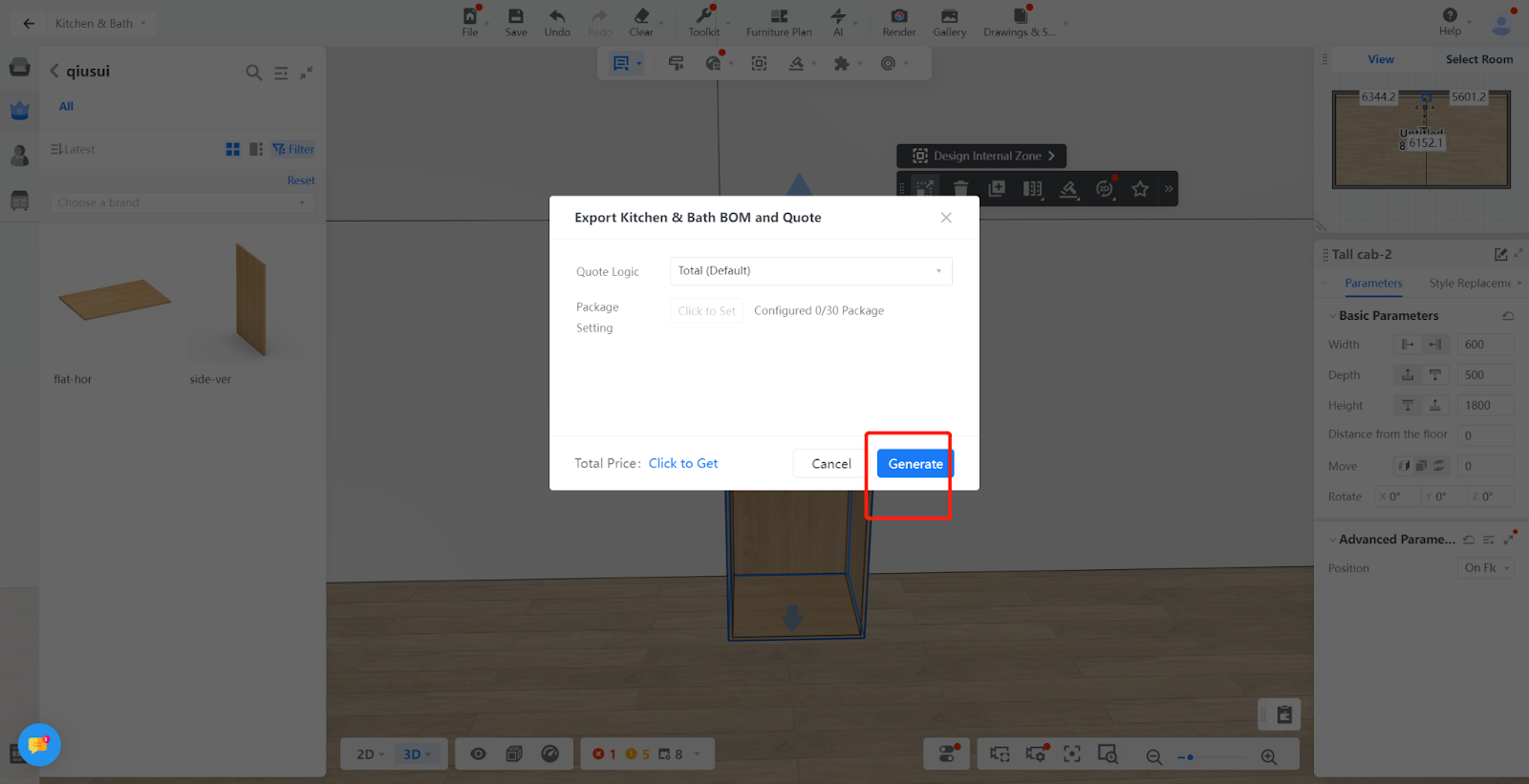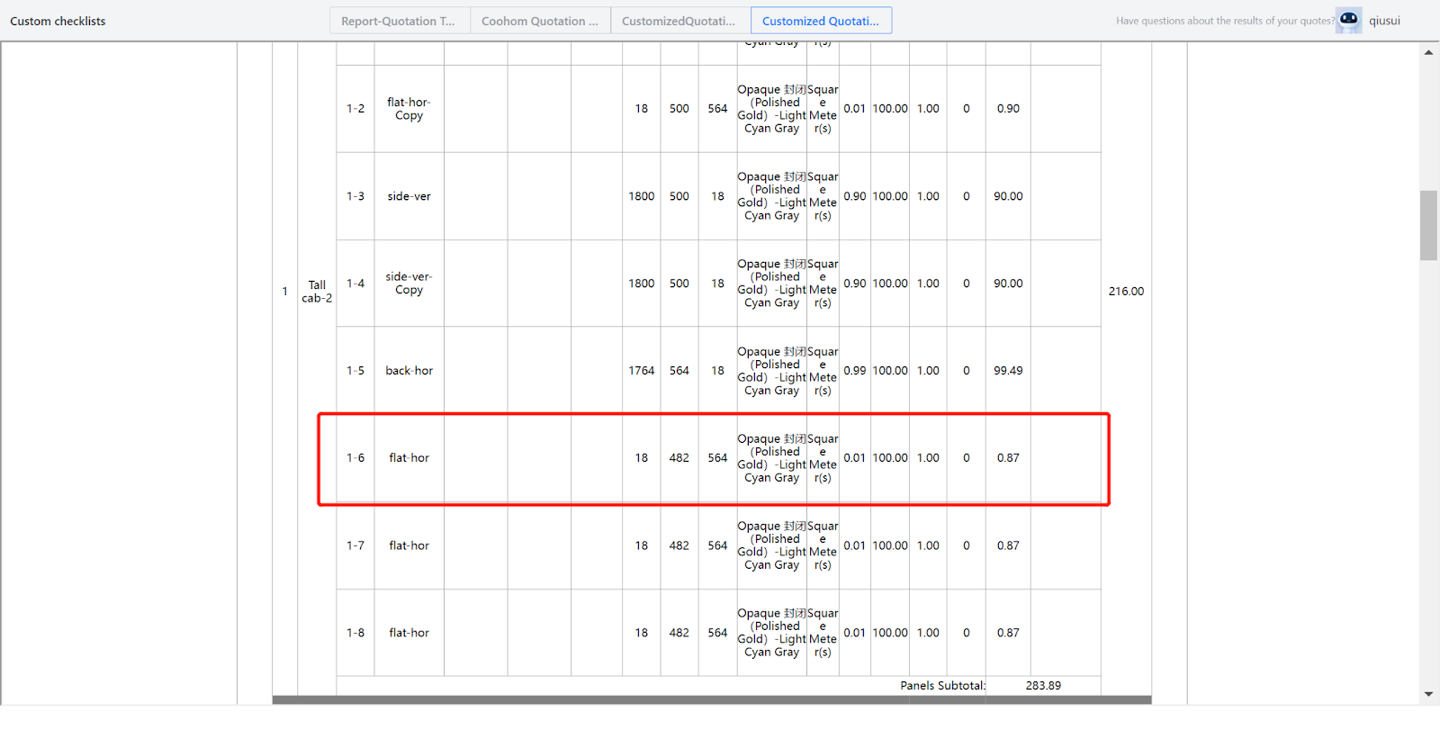 In the customization tool, drag the panel with the quotation category set into the scene, modify the size and material, and download the list to check if the quotation is correct.
