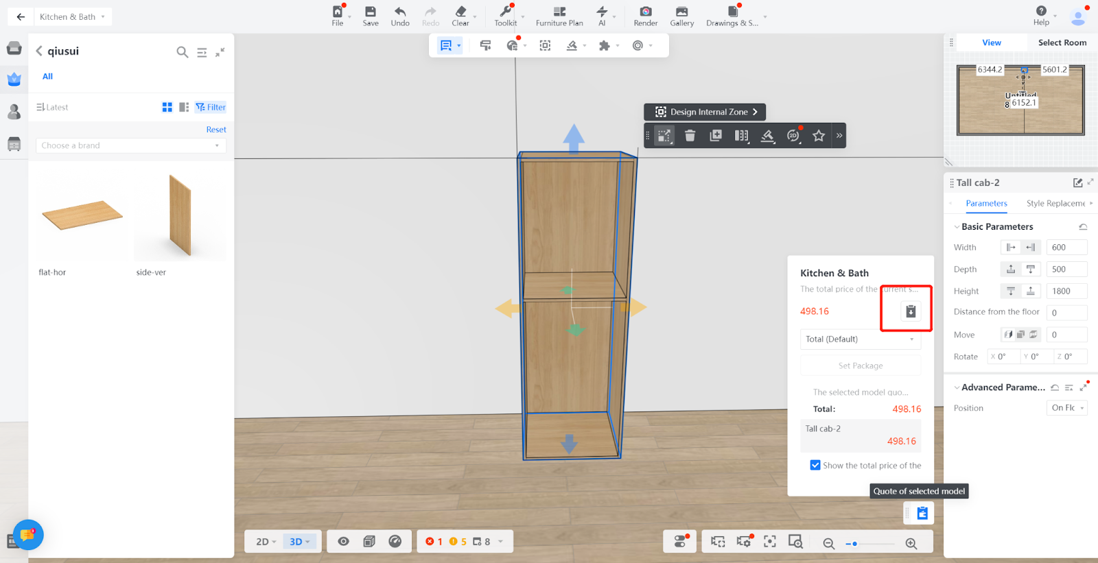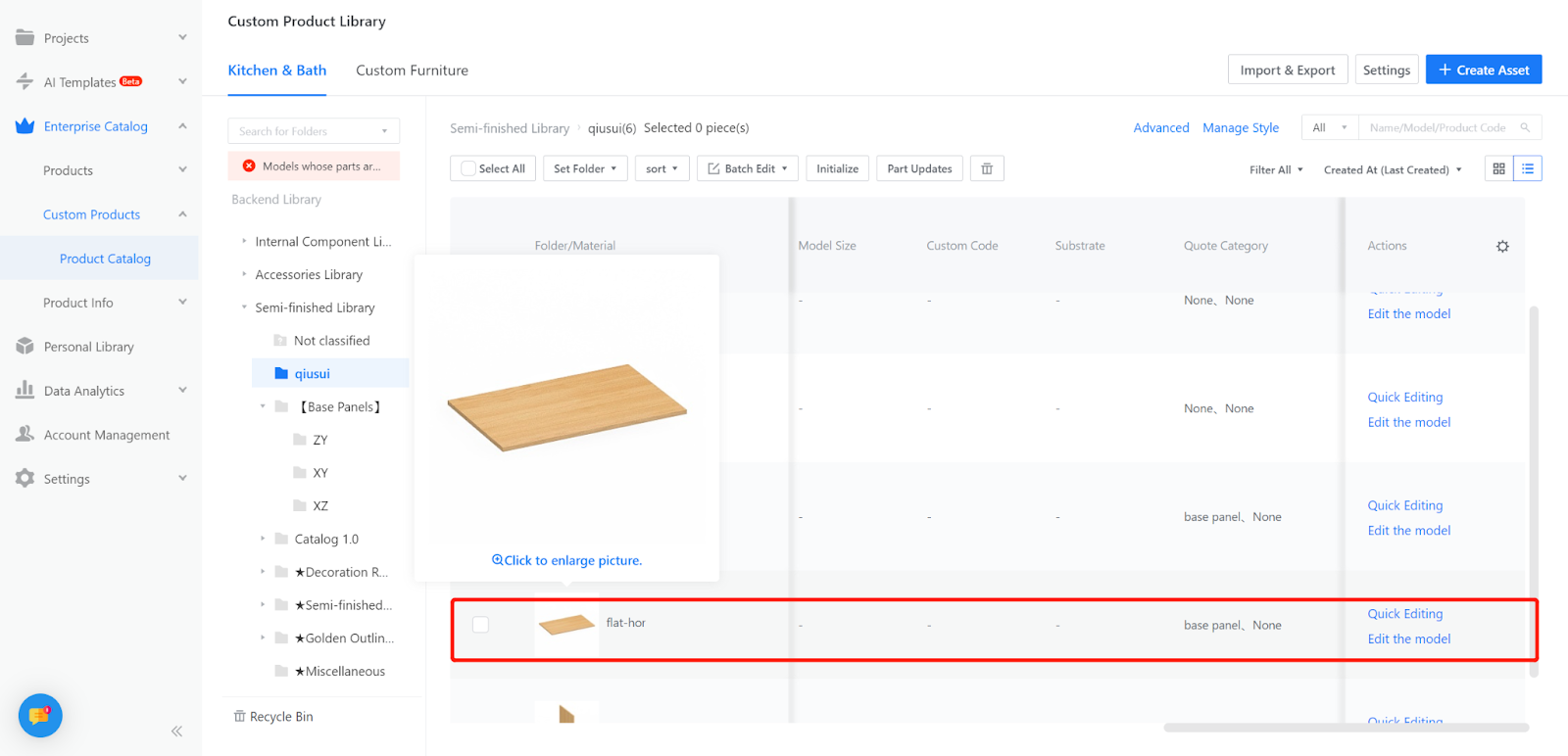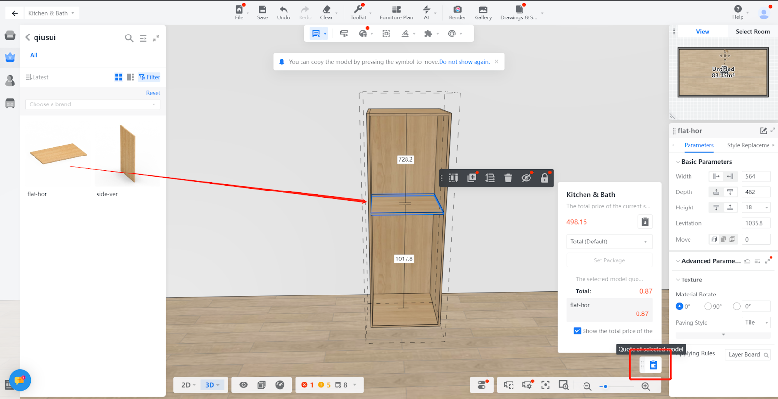 In the customization tool, drag the panel with the quotation category set into the scene, modify the size and material, and download the list to check if the quotation is correct.