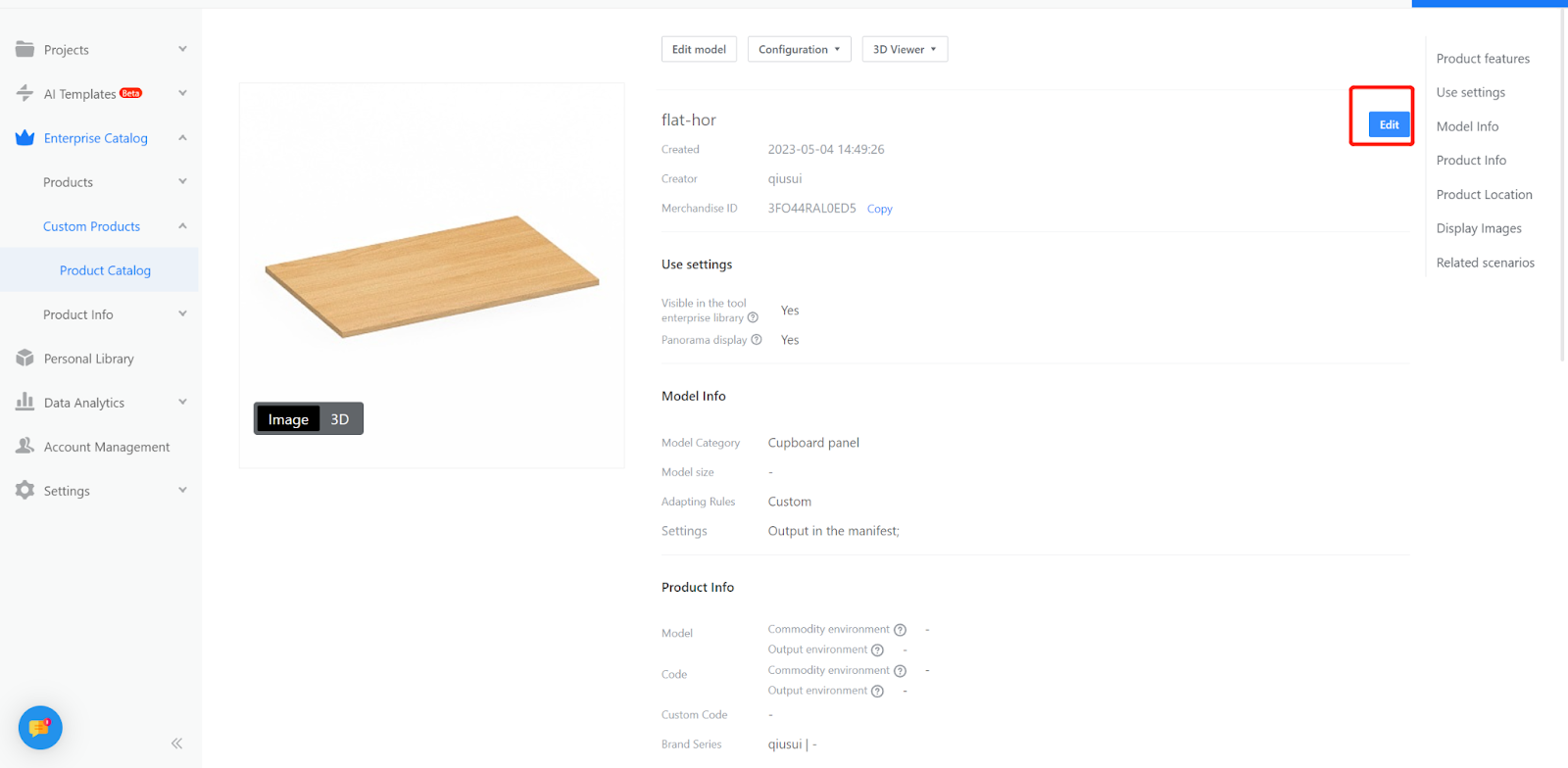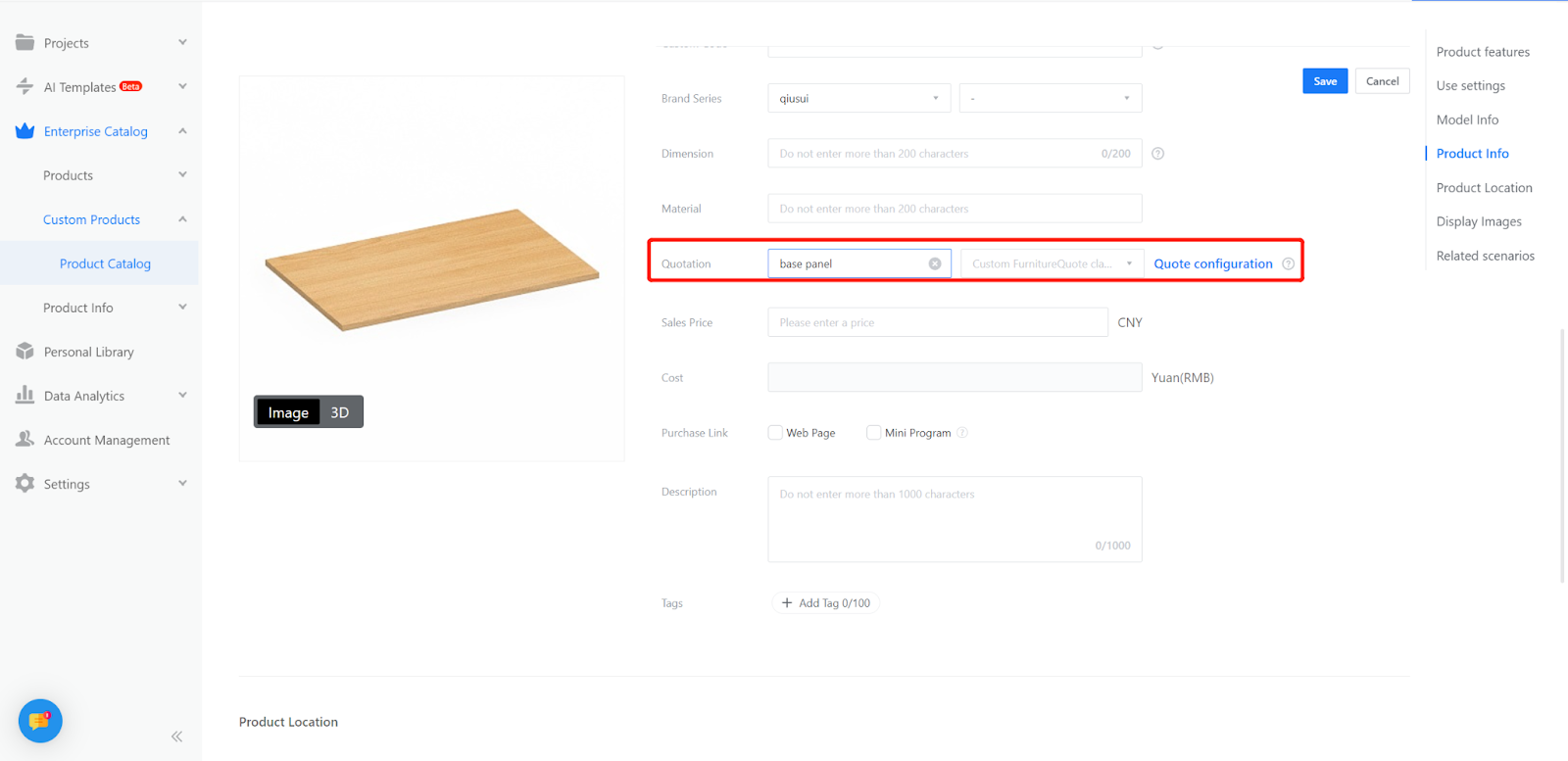 Find the panel to be priced in the backend, hover over it and click the panel to go to the product information page, click "Edit" in the upper right corner, select the quotation category set just now in the quotation category column, and click "Save" .