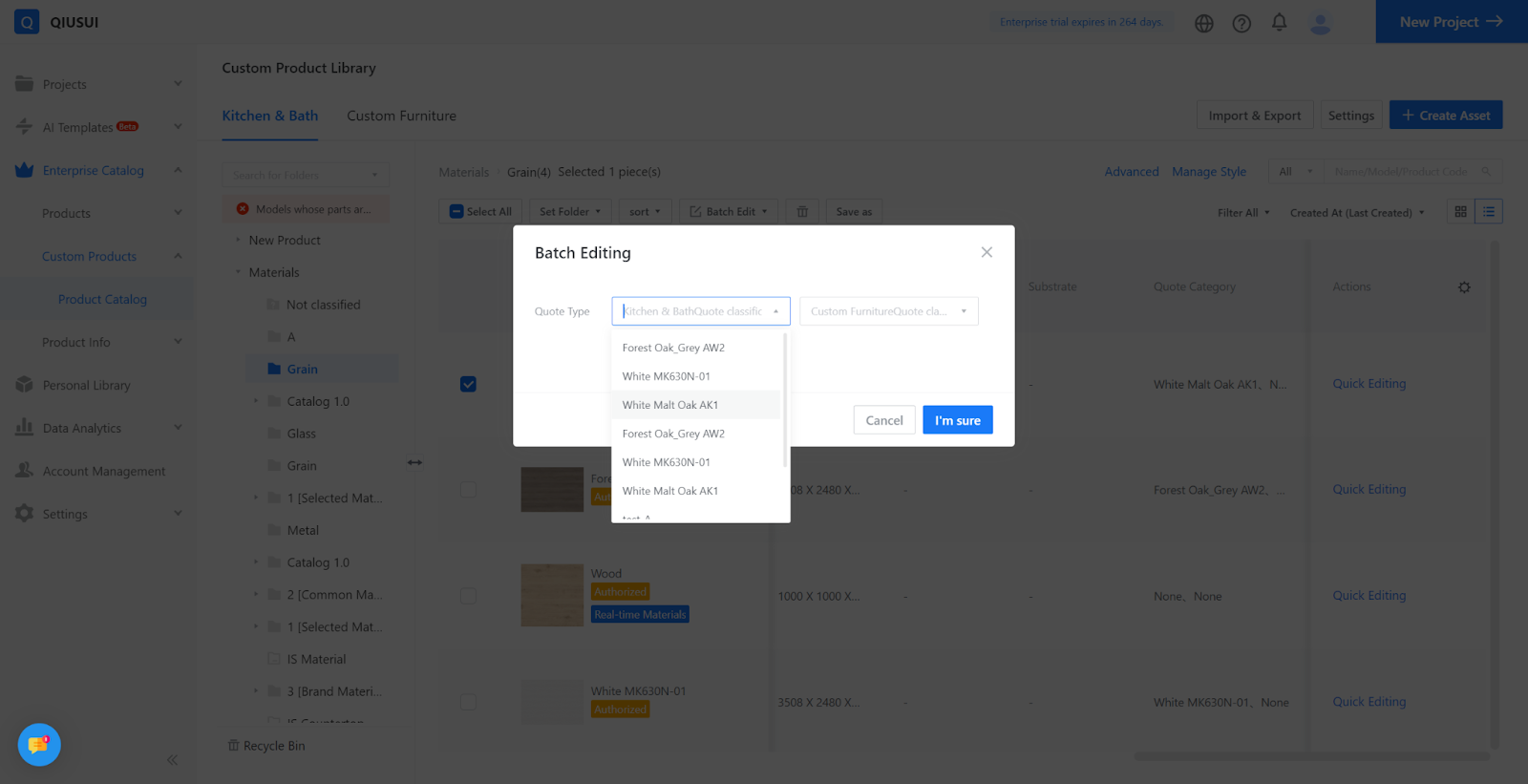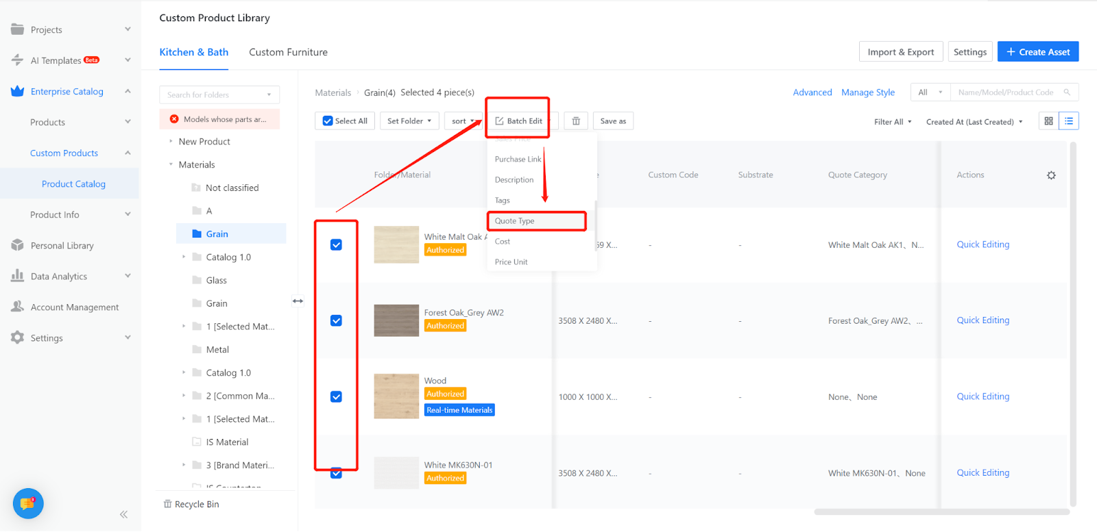 In the backend, find the material to be priced. If multiple materials have the same price, multiple materials in the same category can be selected for batch editing. Choose the corresponding material quotation category.