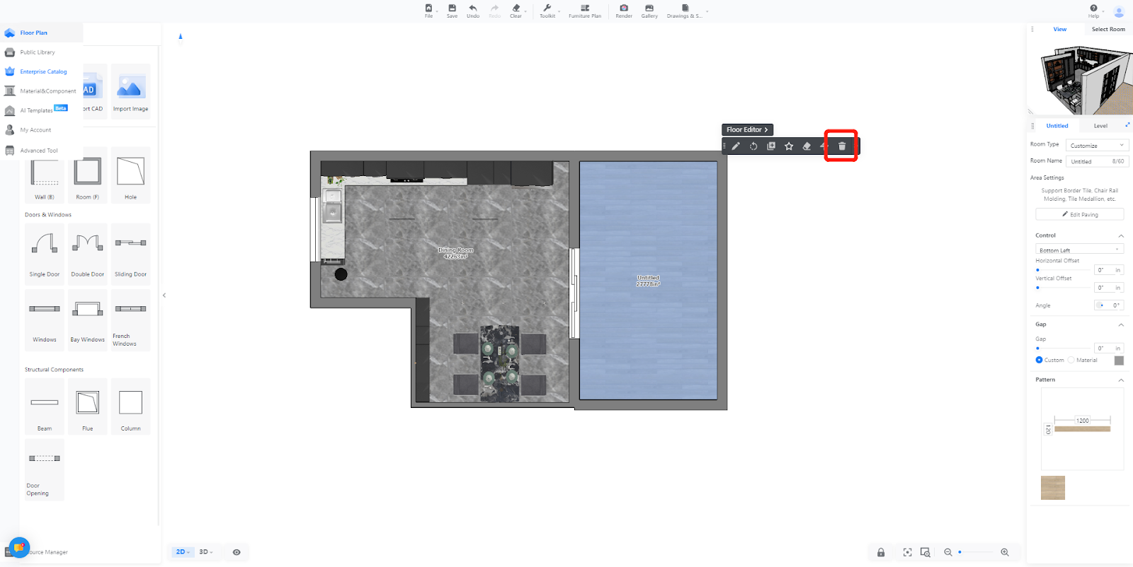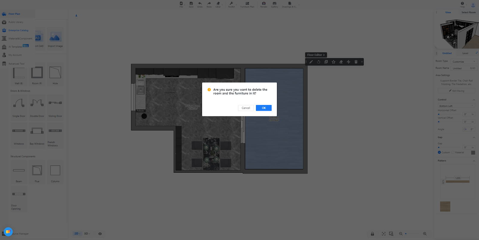 When deleting a selected room, the hard paving will be removed as well. If there are other rooms surrounding the selected room, there is a possibility that the deletion may fail.